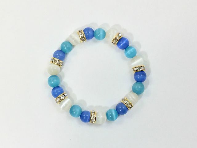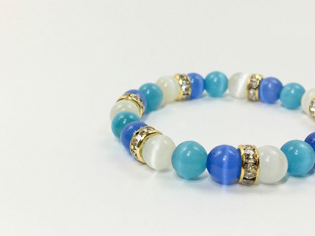 こちらは、8mm玉のブルーキャッツアイ、ライトブルーキャッツアイとホワイトキャッツアイを使用したパワーストーンブレスレットです。間にはゴールドのロンデルを挟み高級感ある大人っぽいデザインに仕上がっています。内周約14cmです。気になる方は是非この機会にどうぞ。