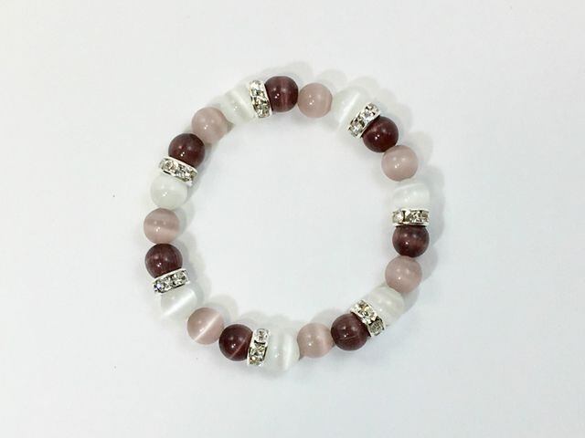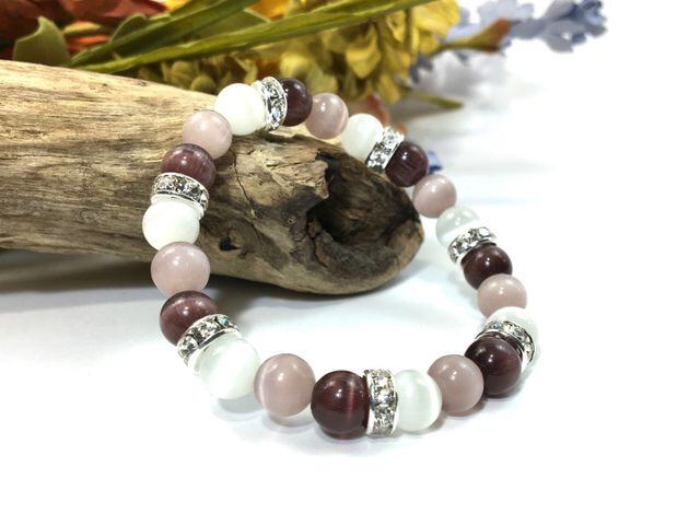 こちらは、8mm玉のパープルキャッツアイ、ライトパープルキャッツアイとホワイトキャッツアイを使用したパワーストーンブレスレットです。間にはシルバーのロンデルを挟み高級感ある大人っぽいデザインに仕上がっています。内周約14cmです。気になる方は是非この機会にどうぞ。