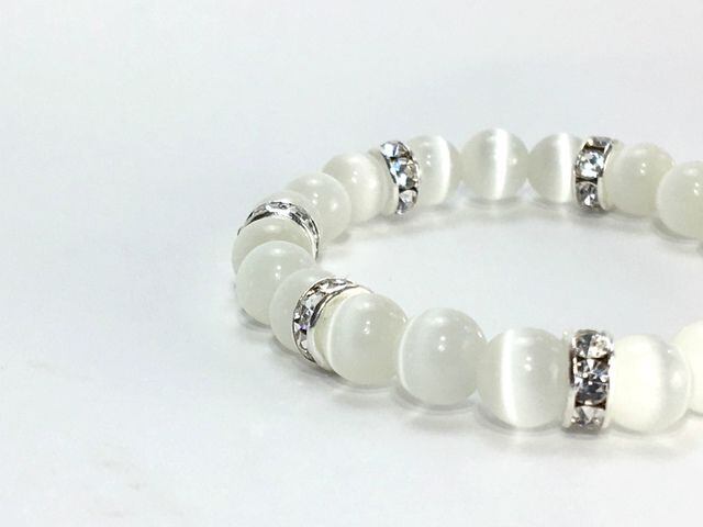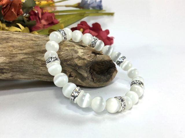 こちらは、8mm玉のホワイトキャッツアイを使用したパワーストーンブレスレットです。間にはシルバーのロンデルを挟み高級感ある大人っぽいデザインに仕上がっています。内周約14cmです。気になる方は是非この機会にどうぞ。