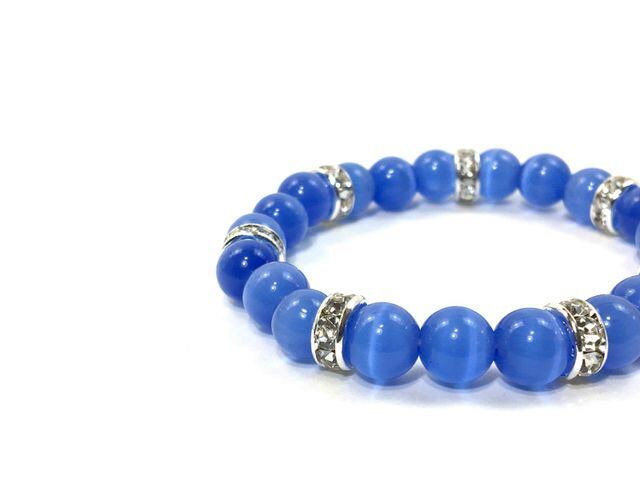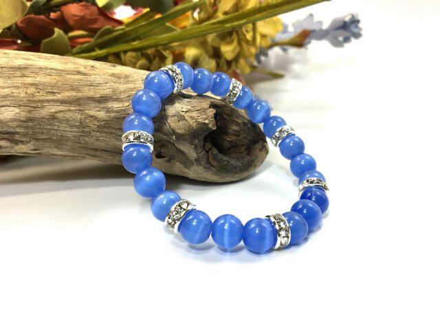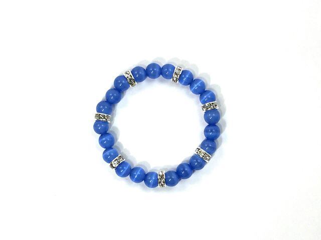 こちらは、8mm玉のブルーキャッツアイを使用したパワーストーンブレスレットです。間にはシルバーのロンデルを挟み高級感ある大人っぽいデザインに仕上がっています。内周約14cmです。気になる方は是非この機会にどうぞ。