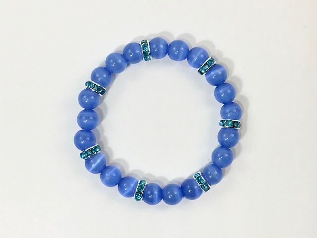 こちらは、8mm玉のブルーキャッツアイを使用したパワーストーンブレスレットです。間にはライトブルーのロンデルを挟み高級感ある大人っぽいデザインに仕上がっています。内周約14cmです。気になる方は是非この機会にどうぞ。