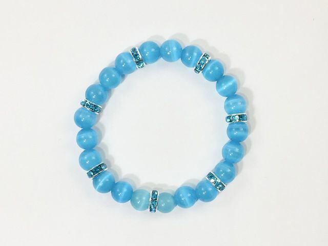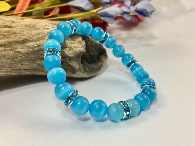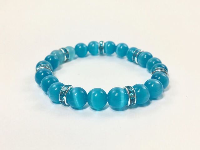 こちらは、8mm玉のライトブルーキャッツアイを使用したパワーストーンブレスレットです。間にはライトブルーのロンデルを挟み高級感ある大人っぽいデザインに仕上がっています。内周約14cmです。気になる方は是非この機会にどうぞ。