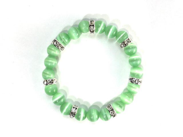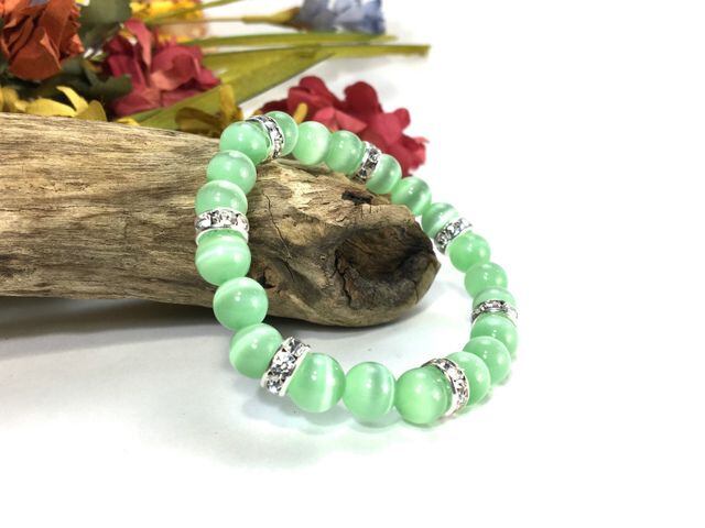 こちらは、8mm玉のライトグリーンキャッツアイを使用したパワーストーンブレスレットです。間にはシルバーのロンデルを挟み高級感ある大人っぽいデザインに仕上がっています。内周約14cmです。気になる方は是非この機会にどうぞ。