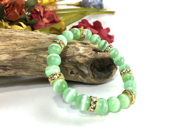 こちらは、8mm玉のライトグリーンキャッツアイを使用したパワーストーンブレスレットです。間にはゴールドのロンデルを挟み高級感ある大人っぽいデザインに仕上がっています。内周約14cmです。気になる方は是非この機会にどうぞ。