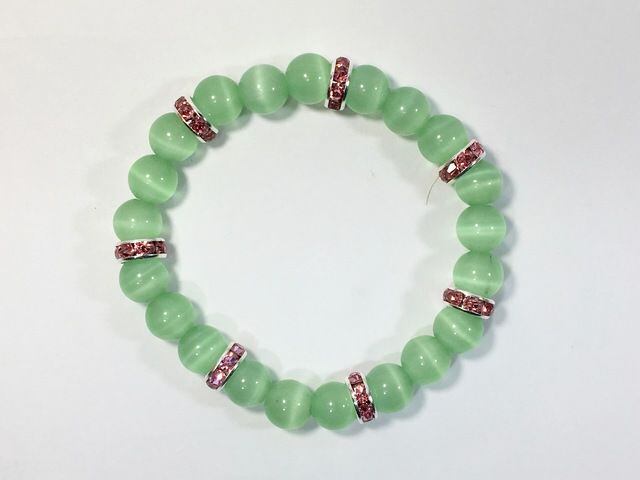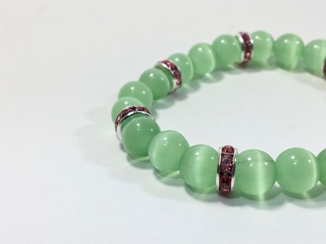 こちらは、8mm玉のライトグリーンキャッツアイを使用したパワーストーンブレスレットです。間にはピンクのロンデルを挟み高級感ある大人っぽいデザインに仕上がっています。内周約14cmです。気になる方は是非この機会にどうぞ。