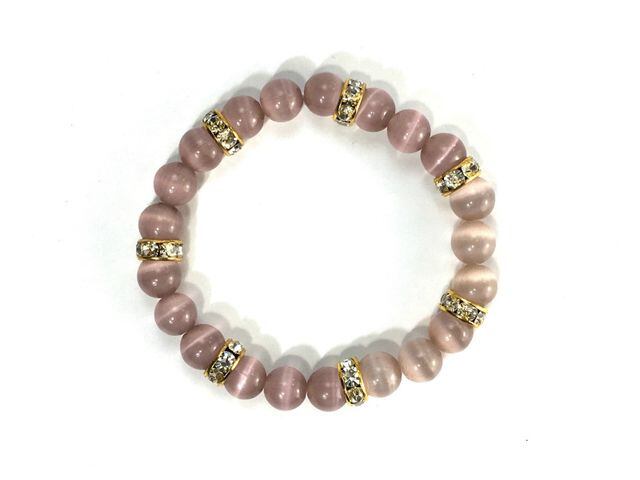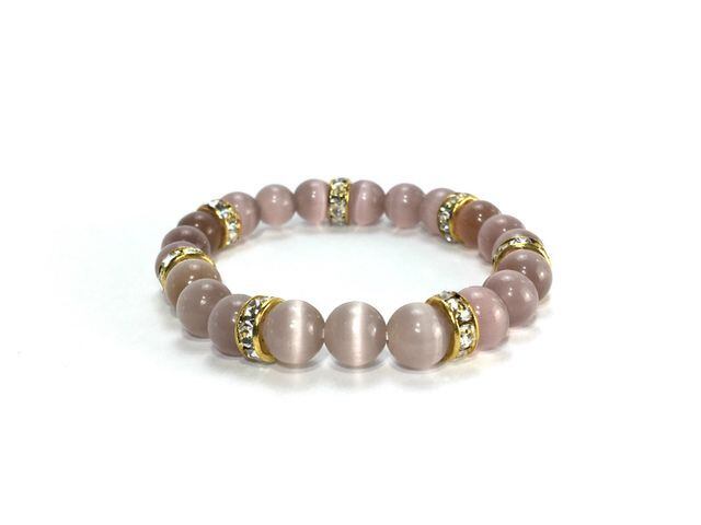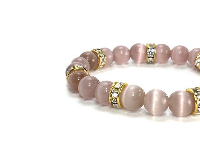 こちらは、8mm玉のライトパープルキャッツアイを使用したパワーストーンブレスレットです。間にはゴールドのロンデルを挟み高級感ある大人っぽいデザインに仕上がっています。内周約14cmです。気になる方は是非この機会にどうぞ。