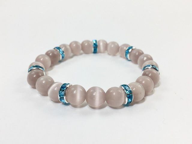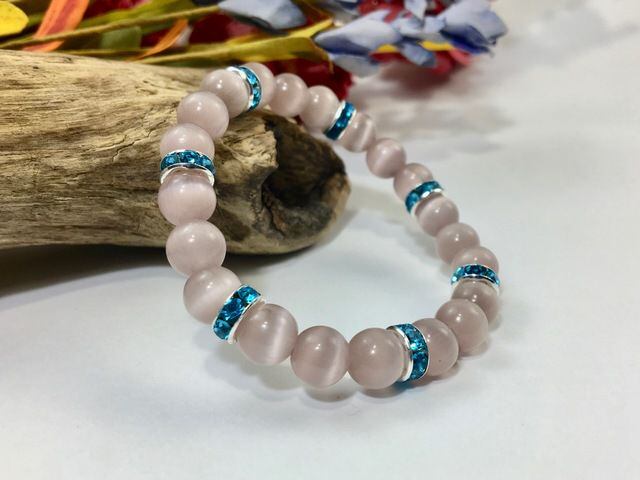 こちらは、8mm玉のライトパープルキャッツアイを使用したパワーストーンブレスレットです。間にはライトブルーのロンデルを挟み高級感ある大人っぽいデザインに仕上がっています。内周約14cmです。気になる方は是非この機会にどうぞ。