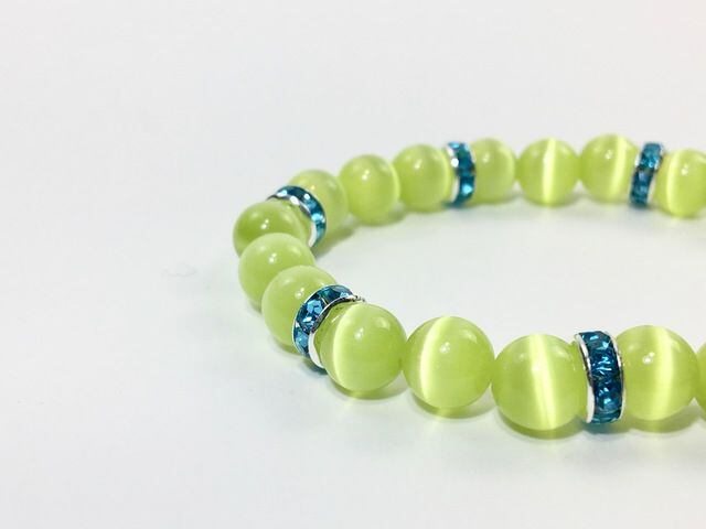 こちらは、8mm玉のライムグリーンキャッツアイを使用したパワーストーンブレスレットです。間にはライトブルーのロンデルを挟み高級感ある大人っぽいデザインに仕上がっています。内周約14cmです。気になる方は是非この機会にどうぞ。