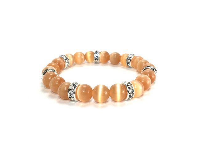こちらは、8mm玉のオレンジキャッツアイを使用したパワーストーンブレスレットです。間にはシルバーのロンデルを挟み高級感ある大人っぽいデザインに仕上がっています。内周約14cmです。気になる方は是非この機会にどうぞ。
