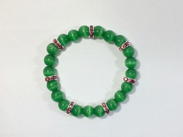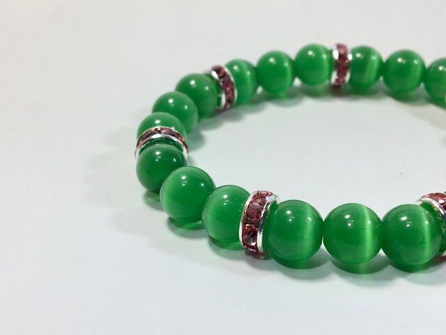 こちらは、8mm玉のグリーンキャッツアイを使用したパワーストーンブレスレットです。間にはライトブルーのロンデルを挟み高級感ある大人っぽいデザインに仕上がっています。内周約14cmです。気になる方は是非この機会にどうぞ。