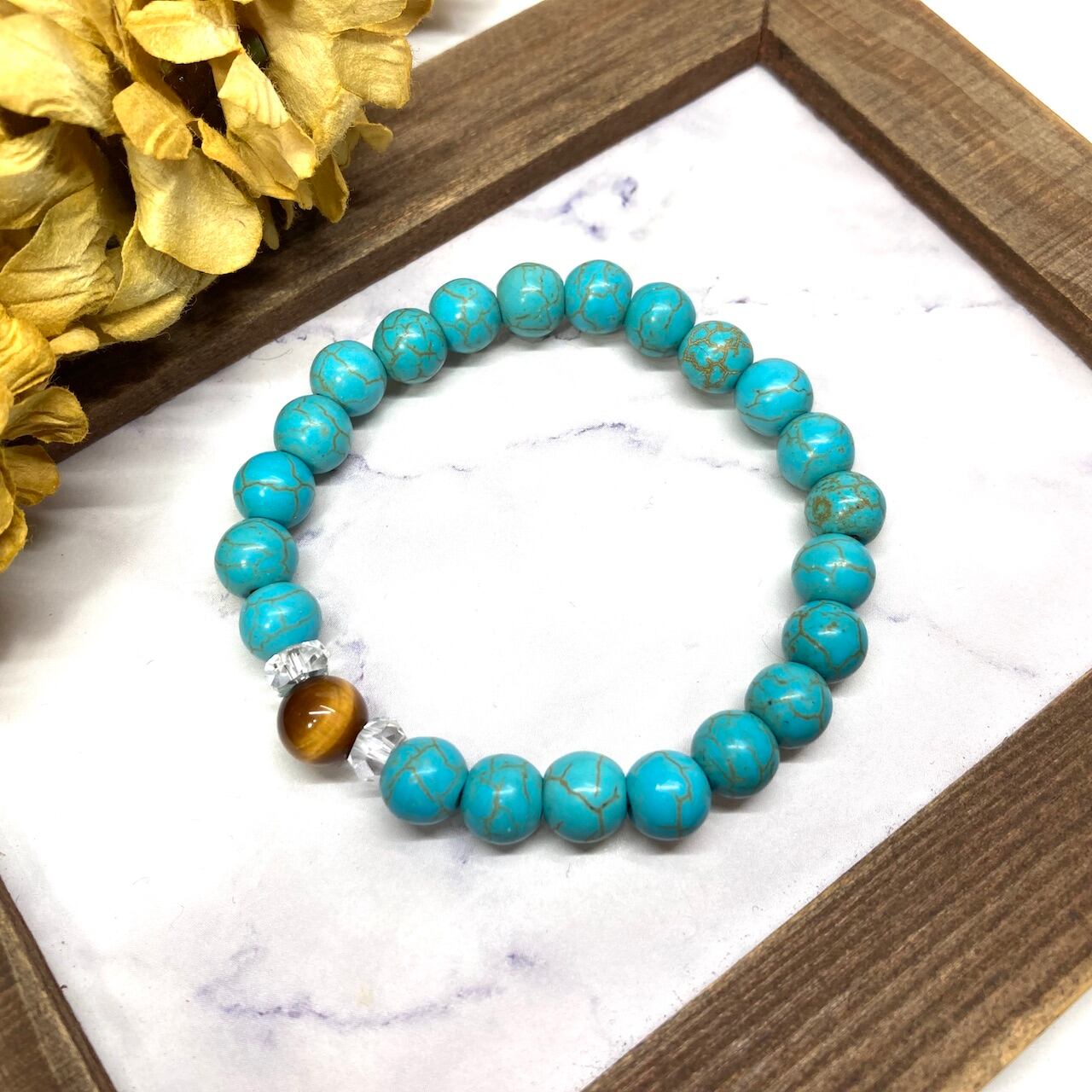こちらは、タイガーアイとターコイズを組み合わせた一粒ブレスレットです。今回はお買い得プライスにて販売しておりますので是非この機会にどうぞ。(お買い得プライスは予告なく終了する場合がありますのでお早めに!!) 石大きさ8mm玉で基本サイズは内周15cm(サイズ変更は1cmあたり100円で承っております。サイズ変更の場合は金額変更しますのでメッセージにてご連絡くださいませ。)です。