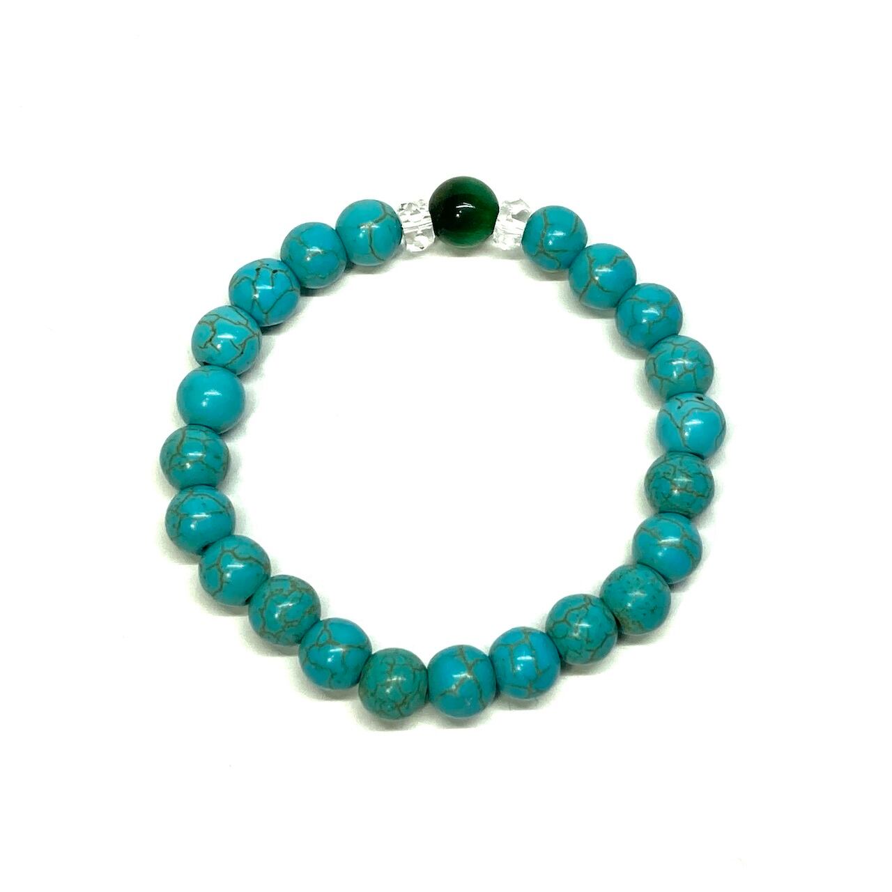 こちらは、グリーンタイガーアイとターコイズを組み合わせた一粒ブレスレットです。今回はお買い得プライスにて販売しておりますので是非この機会にどうぞ。(お買い得プライスは予告なく終了する場合がありますのでお早めに!!) 石大きさ8mm玉で基本サイズは内周15cm(サイズ変更は1cmあたり100円で承っております。サイズ変更の場合は金額変更しますのでメッセージにてご連絡くださいませ。)です。