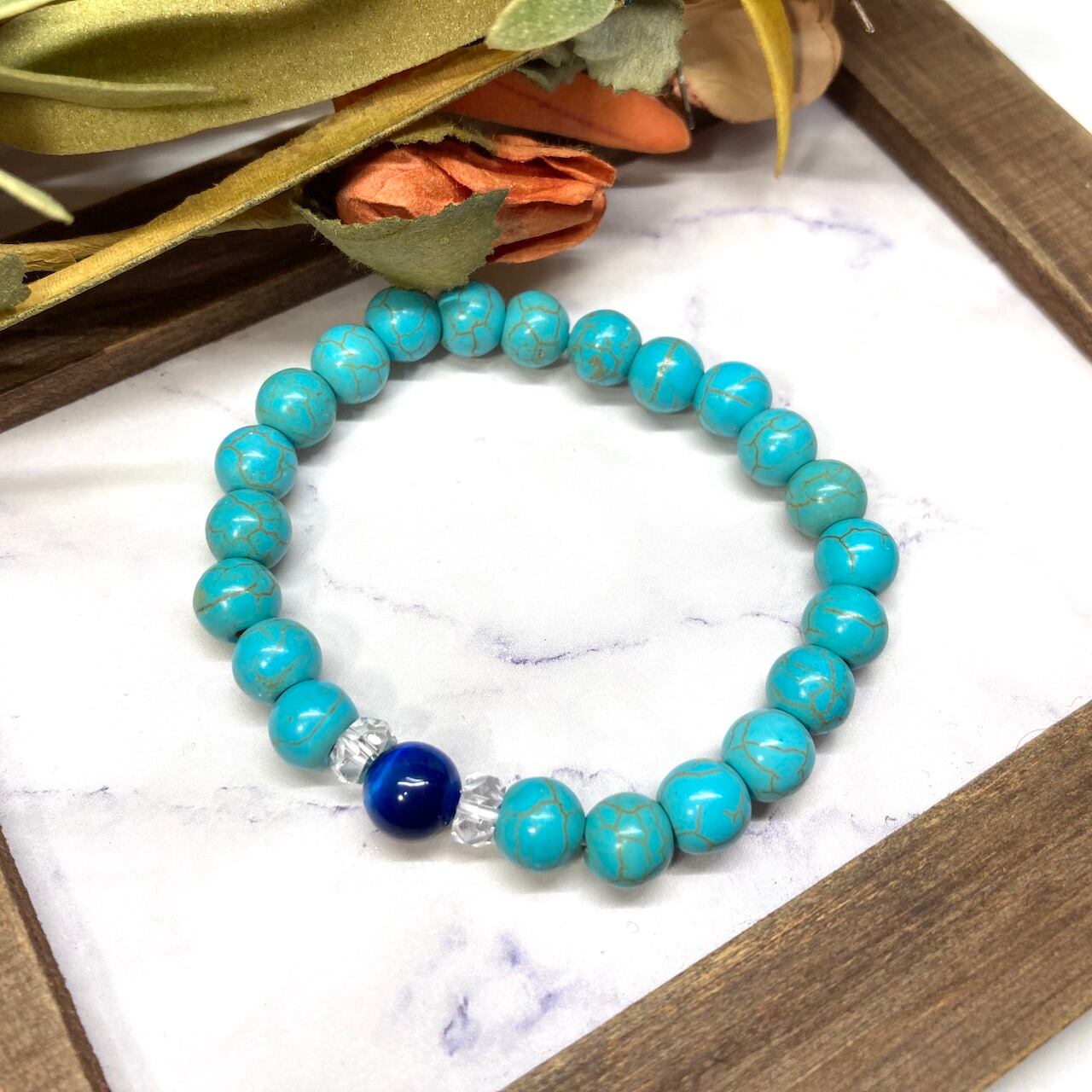 こちらは、ブルータイガーアイとターコイズを組み合わせた一粒ブレスレットです。今回はお買い得プライスにて販売しておりますので是非この機会にどうぞ。(お買い得プライスは予告なく終了する場合がありますのでお早めに!!) 石大きさ8mm玉で基本サイズは内周15cm(サイズ変更は1cmあたり100円で承っております。サイズ変更の場合は金額変更しますのでメッセージにてご連絡くださいませ。)です。