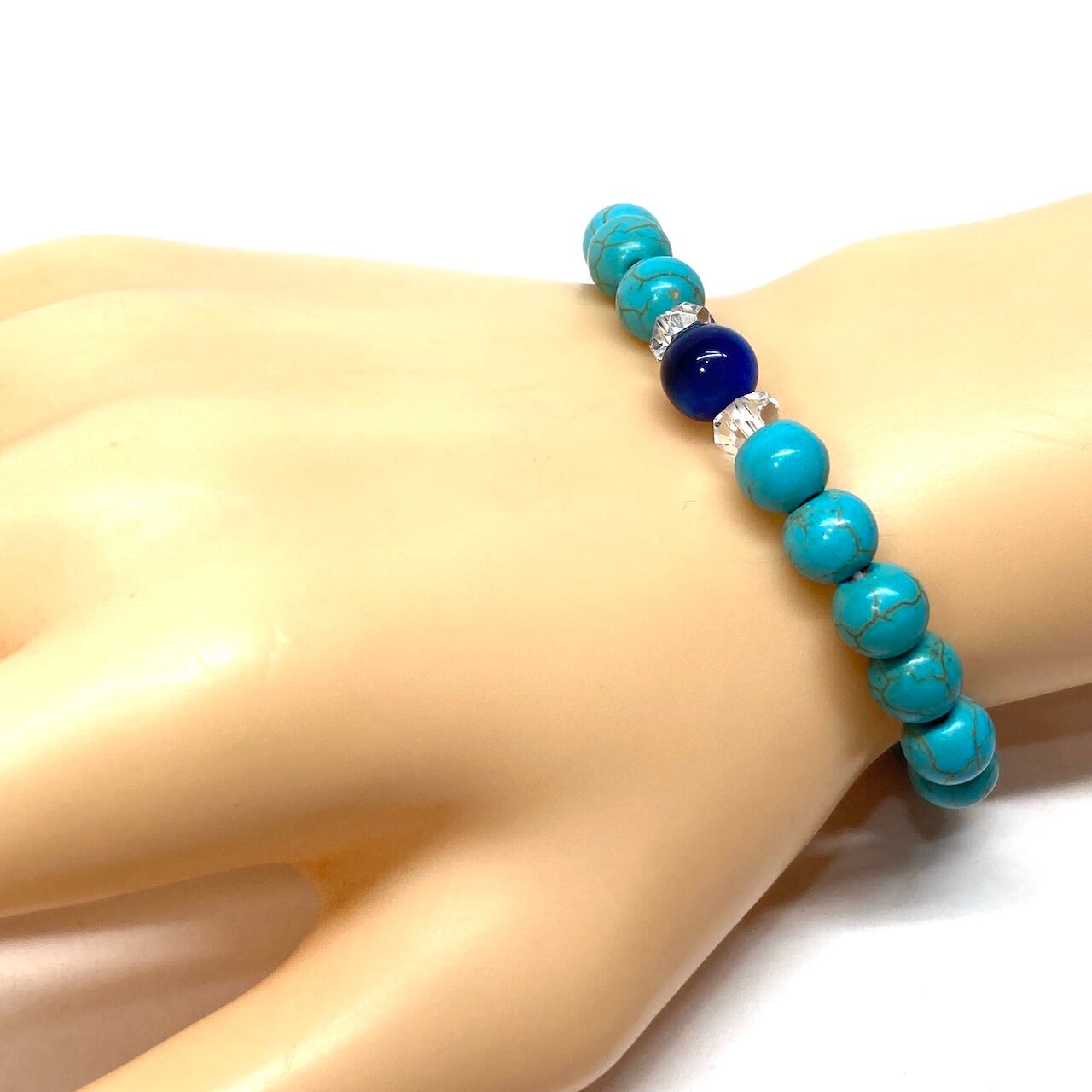 [ターコイズ (練り)]邪悪なものを退けて、幸運を引き寄せると伝えられるいるターコイズは、困難を乗り越えて願望達成をお手伝いしてくれると言われる、目標達成のお守りに人気のパワーストーンです。 災いから身を守り、成功へと導くと言い伝えられています。 仕事においての成功運を込めたお守りとして、また旅のお守りとして最適な意味合いのパワーストーンです。