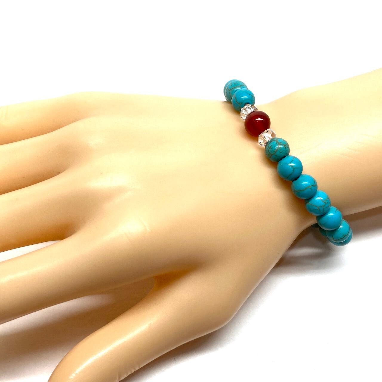 こちらは、赤瑪瑙とターコイズを組み合わせた一粒ブレスレットです。今回はお買い得プライスにて販売しておりますので是非この機会にどうぞ。(お買い得プライスは予告なく終了する場合がありますのでお早めに!!) 石大きさ8mm玉で基本サイズは内周15cm(サイズ変更は1cmあたり100円で承っております。サイズ変更の場合は金額変更しますのでメッセージにてご連絡くださいませ。)です。