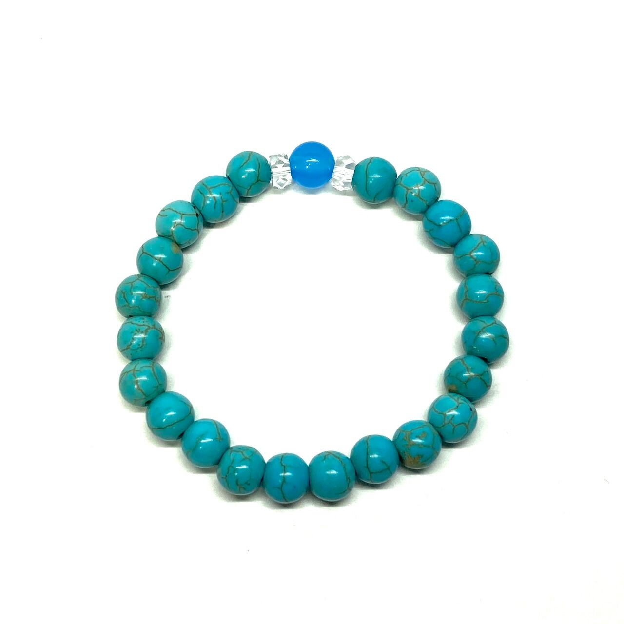 こちらは、青瑪瑙とターコイズを組み合わせた一粒ブレスレットです。今回はお買い得プライスにて販売しておりますので是非この機会にどうぞ。(お買い得プライスは予告なく終了する場合がありますのでお早めに!!) 石大きさ8mm玉で基本サイズは内周15cm(サイズ変更は1cmあたり100円で承っております。サイズ変更の場合は金額変更しますのでメッセージにてご連絡くださいませ。)です。