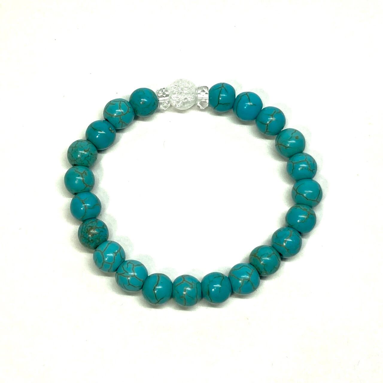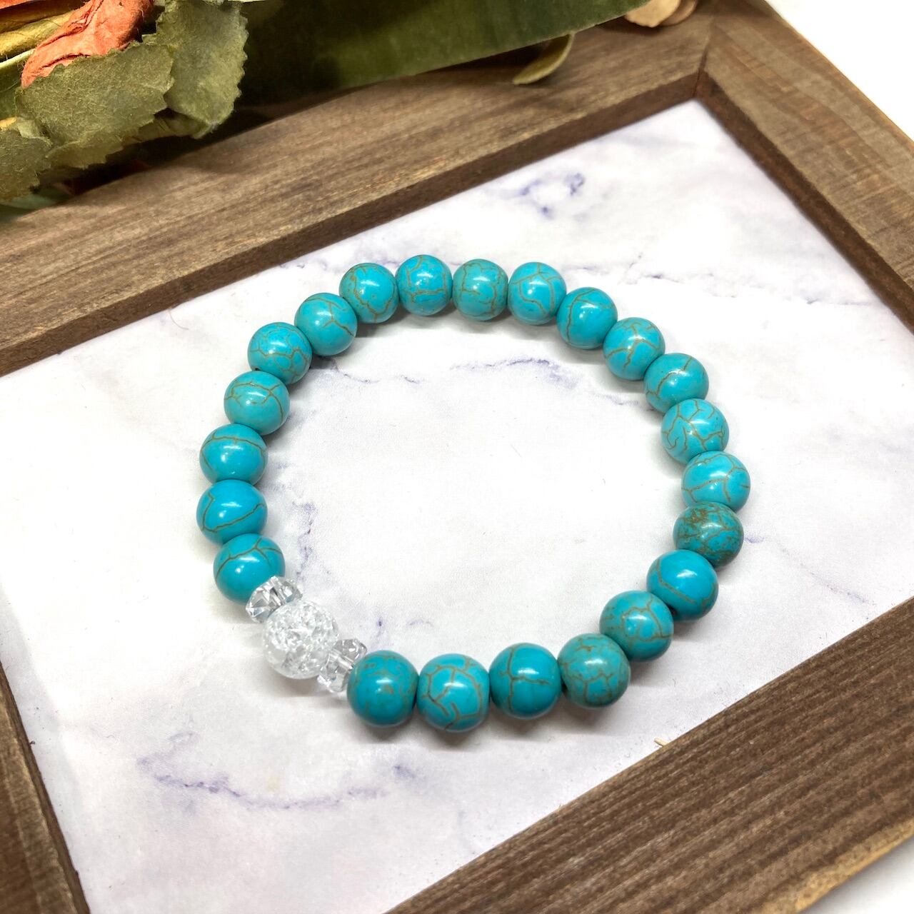 こちらは、クラック水晶とターコイズを組み合わせた一粒ブレスレットです。今回はお買い得プライスにて販売しておりますので是非この機会にどうぞ。(お買い得プライスは予告なく終了する場合がありますのでお早めに!!) 石大きさ8mm玉で基本サイズは内周15cm(サイズ変更は1cmあたり100円で承っております。サイズ変更の場合は金額変更しますのでメッセージにてご連絡くださいませ。)です。