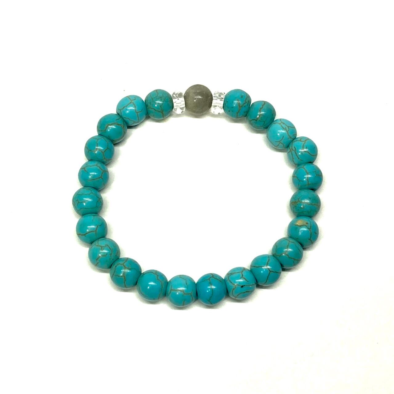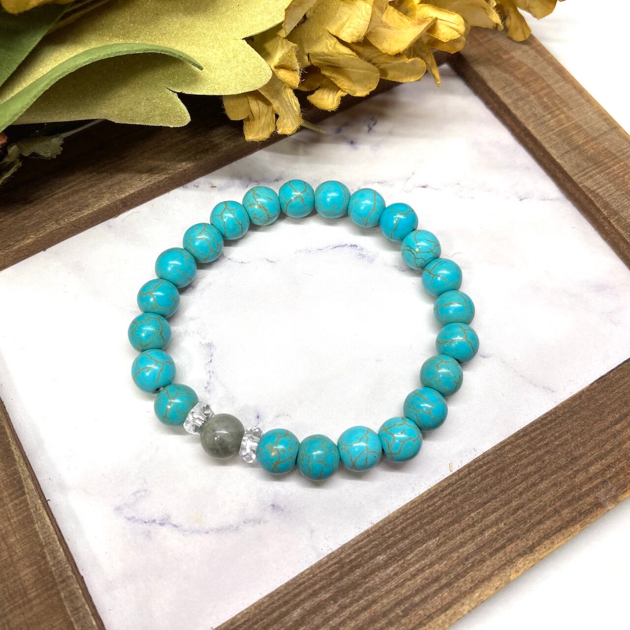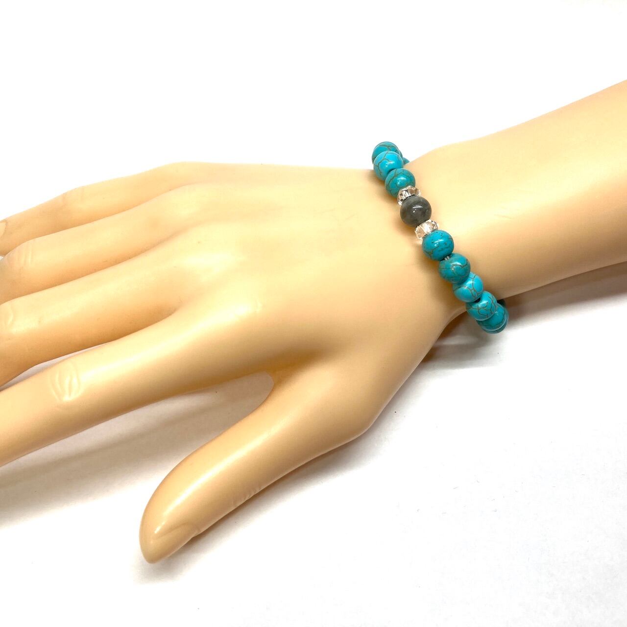 こちらは、ラブラドライトとターコイズを組み合わせた一粒ブレスレットです。今回はお買い得プライスにて販売しておりますので是非この機会にどうぞ。(お買い得プライスは予告なく終了する場合がありますのでお早めに!!) 石大きさ8mm玉で基本サイズは内周15cm(サイズ変更は1cmあたり100円で承っております。サイズ変更の場合は金額変更しますのでメッセージにてご連絡くださいませ。)です。