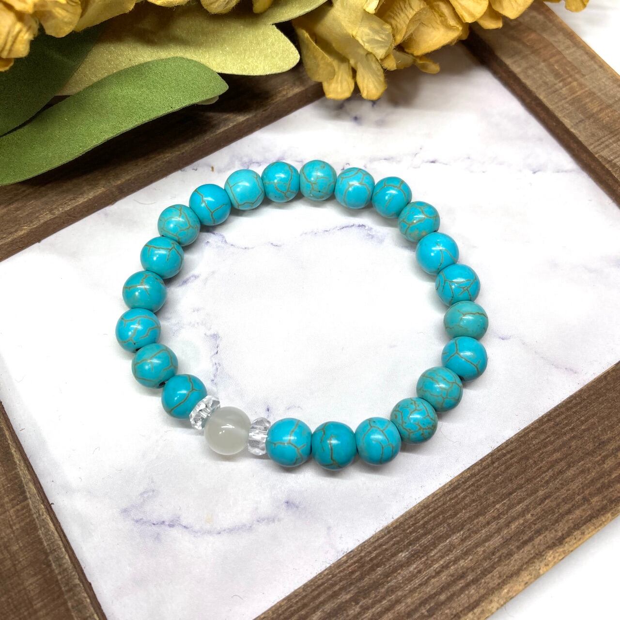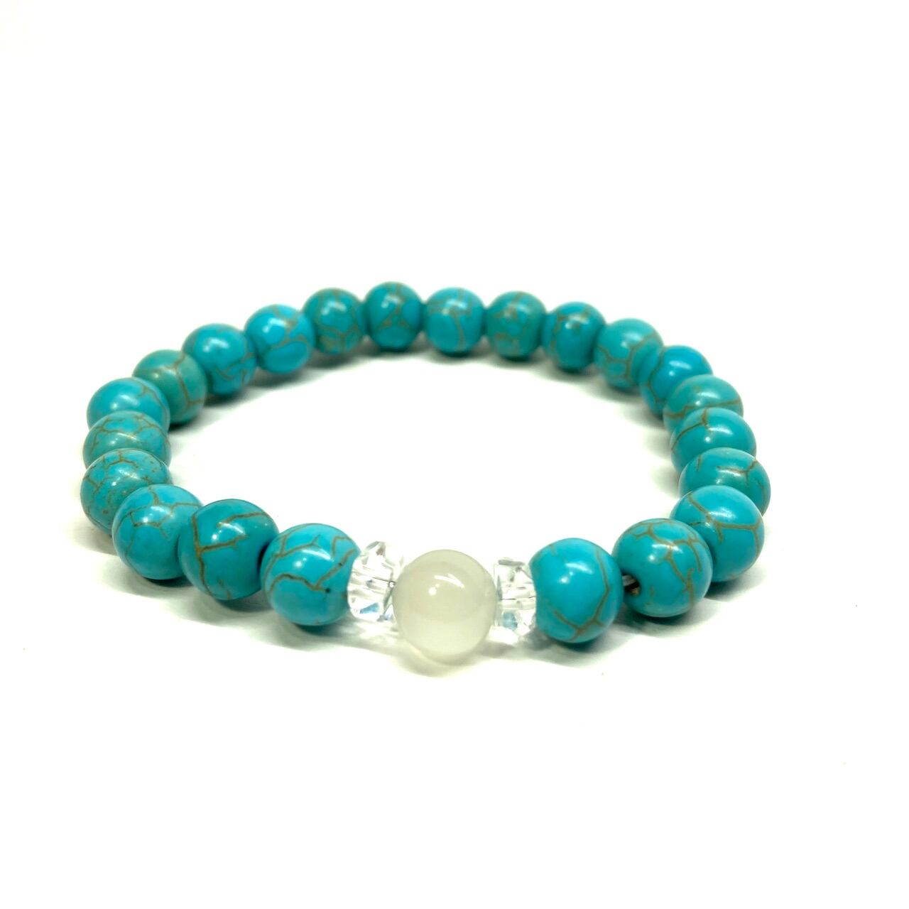 こちらは、ムーンストーンとターコイズを組み合わせた一粒ブレスレットです。今回はお買い得プライスにて販売しておりますので是非この機会にどうぞ。(お買い得プライスは予告なく終了する場合がありますのでお早めに!!) 石大きさ8mm玉で基本サイズは内周15cm(サイズ変更は1cmあたり100円で承っております。サイズ変更の場合は金額変更しますのでメッセージにてご連絡くださいませ。)です。