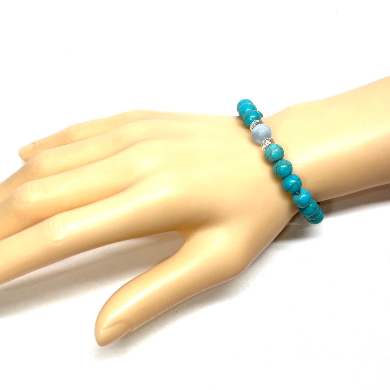 こちらは、アクアマリンとターコイズを組み合わせた一粒ブレスレットです。今回はお買い得プライスにて販売しておりますので是非この機会にどうぞ。(お買い得プライスは予告なく終了する場合がありますのでお早めに!!) 石大きさ8mm玉で基本サイズは内周15cm(サイズ変更は1cmあたり100円で承っております。サイズ変更の場合は金額変更しますのでメッセージにてご連絡くださいませ。)です。