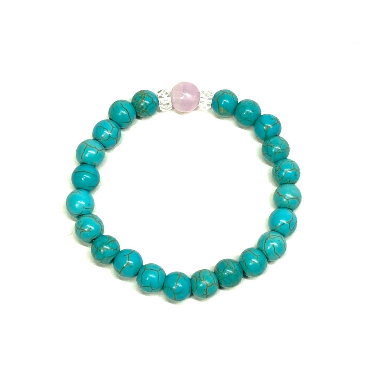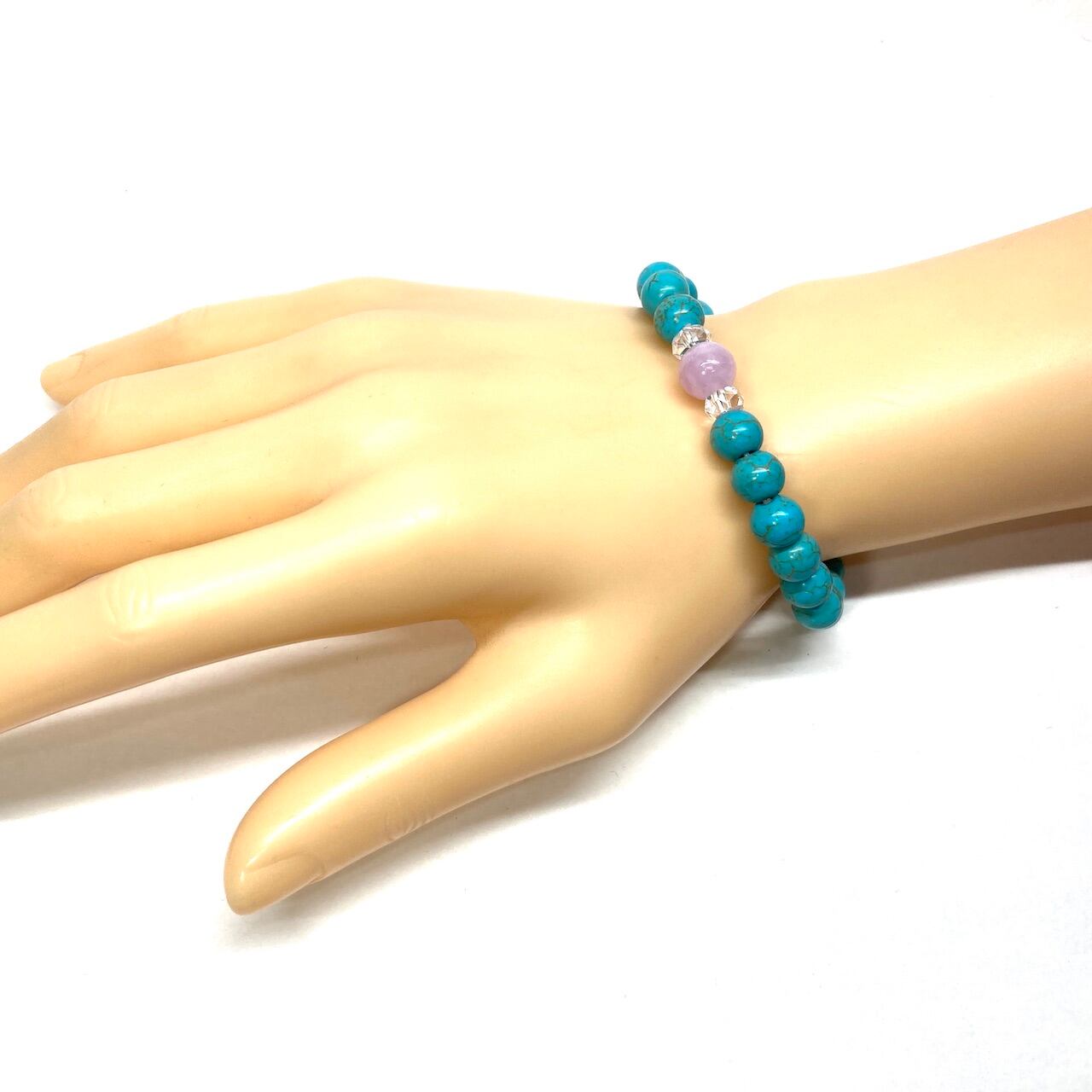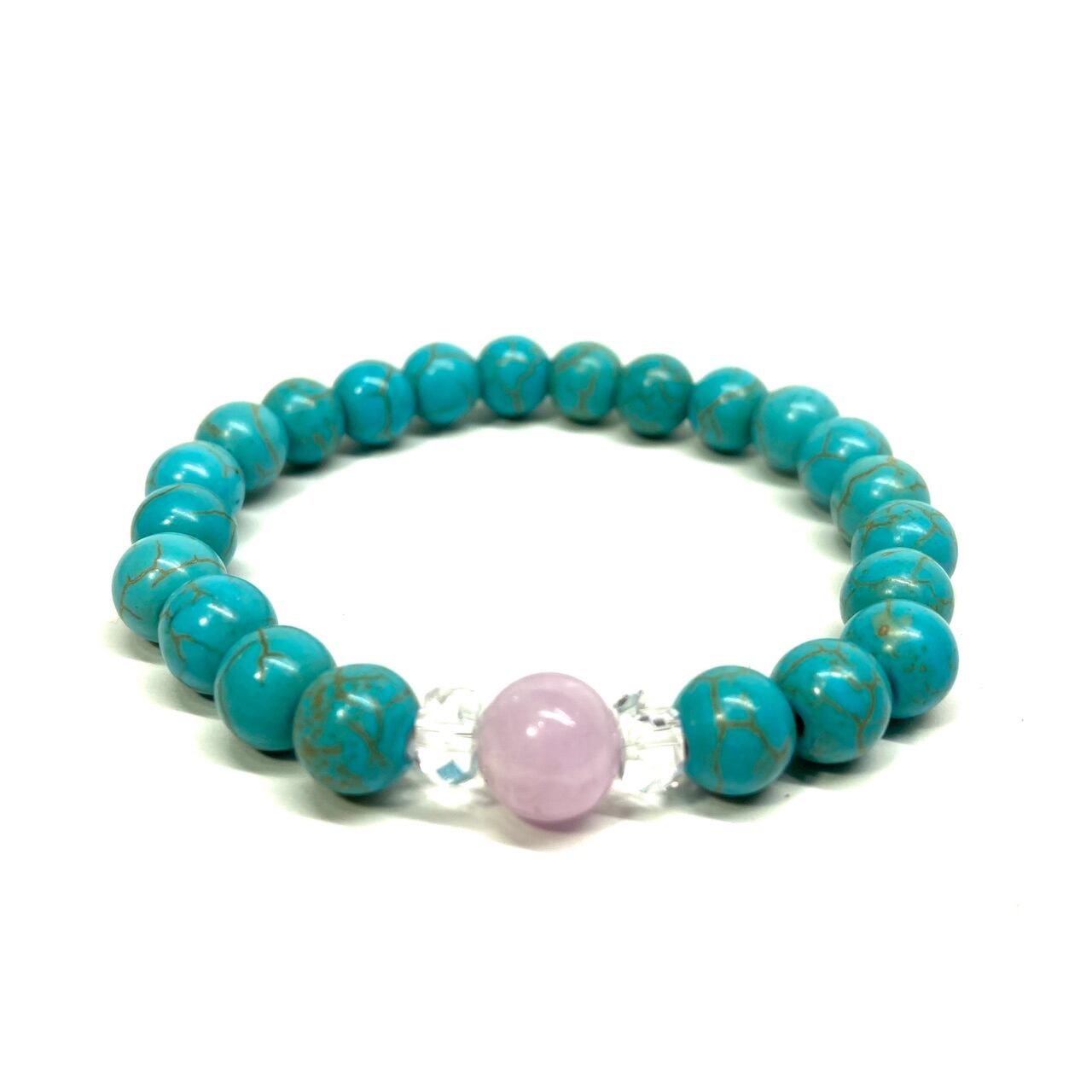 こちらは、クンツァイトとターコイズを組み合わせた一粒ブレスレットです。今回はお買い得プライスにて販売しておりますので是非この機会にどうぞ。(お買い得プライスは予告なく終了する場合がありますのでお早めに!!) 石大きさ8mm玉で基本サイズは内周15cm(サイズ変更は1cmあたり100円で承っております。サイズ変更の場合は金額変更しますのでメッセージにてご連絡くださいませ。)です。