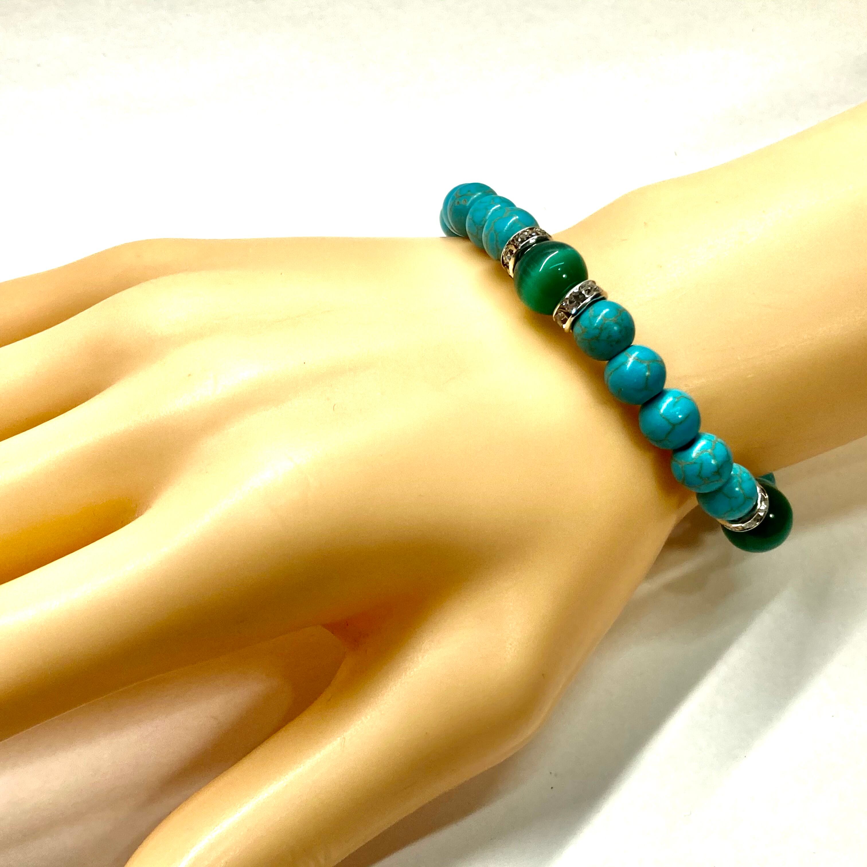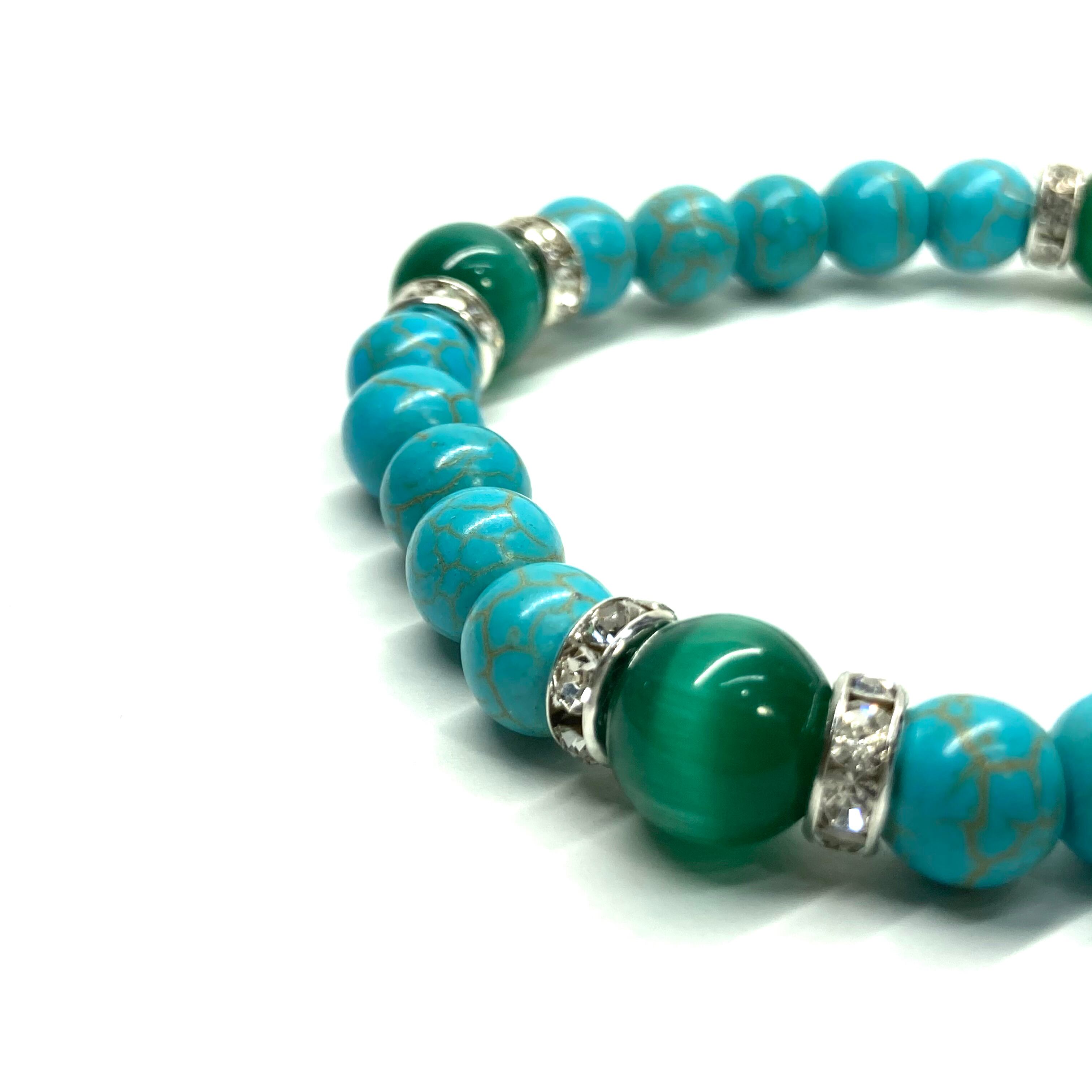 こちらは、8mm玉のキャッツアイとターコイズを使用したパワーストーンブレスレットです。間にはロンデルを挟み高級感ある大人っぽいデザインに仕上がっています。内周約17cmです。気になる方は是非この機会にどうぞ。 【ブレスレット内周サイズ】 内周約17cm 【使用している石、サイズ】 ターコイズ(8mm)・キャッツアイ(10mm) 石は全て浄化済みのものを使っています。
