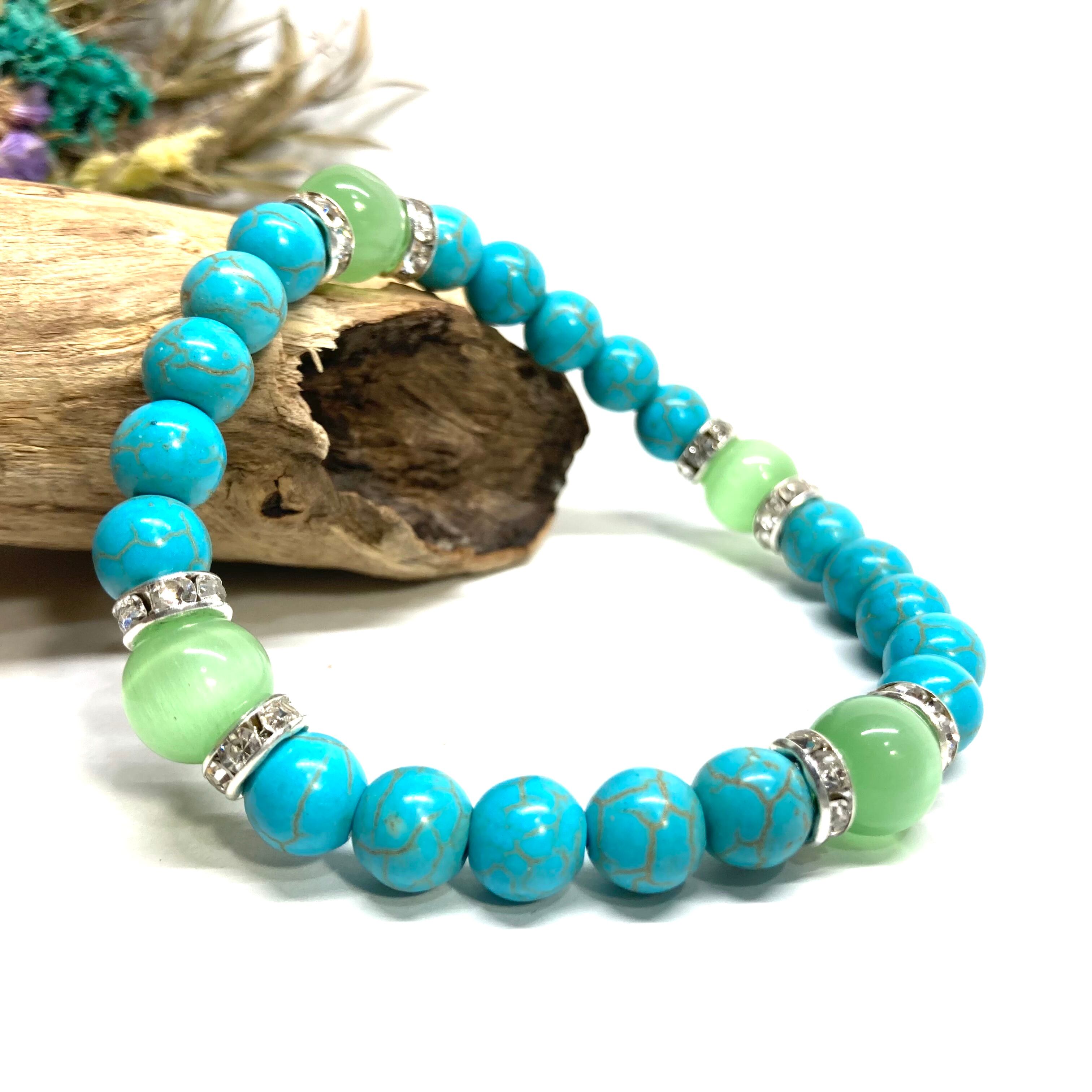 こちらは、8mm玉のキャッツアイとターコイズを使用したパワーストーンブレスレットです。間にはロンデルを挟み高級感ある大人っぽいデザインに仕上がっています。内周約17cmです。気になる方は是非この機会にどうぞ。 【ブレスレット内周サイズ】 内周約17cm 【使用している石、サイズ】 ターコイズ(8mm)・キャッツアイ(10mm) 石は全て浄化済みのものを使っています。