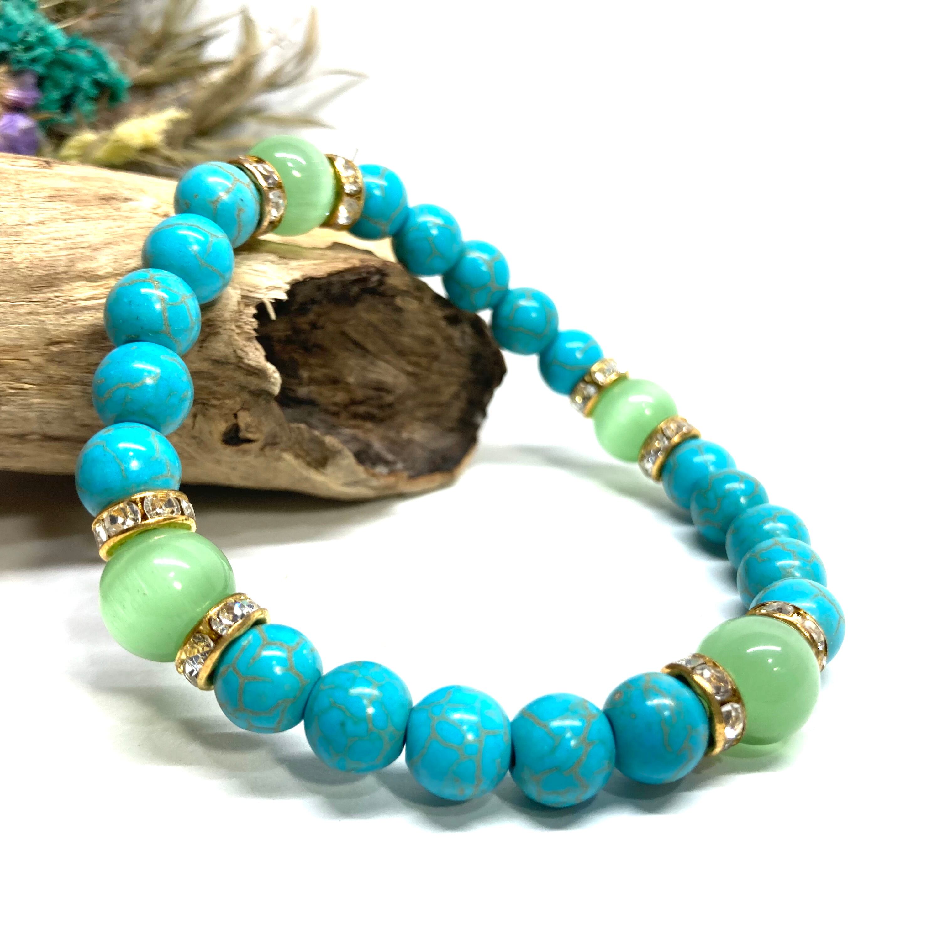 こちらは、8mm玉のキャッツアイとターコイズを使用したパワーストーンブレスレットです。間にはロンデルを挟み高級感ある大人っぽいデザインに仕上がっています。内周約17cmです。気になる方は是非この機会にどうぞ。 【ブレスレット内周サイズ】 内周約17cm 【使用している石、サイズ】 ターコイズ(8mm)・キャッツアイ(10mm) 石は全て浄化済みのものを使っています。