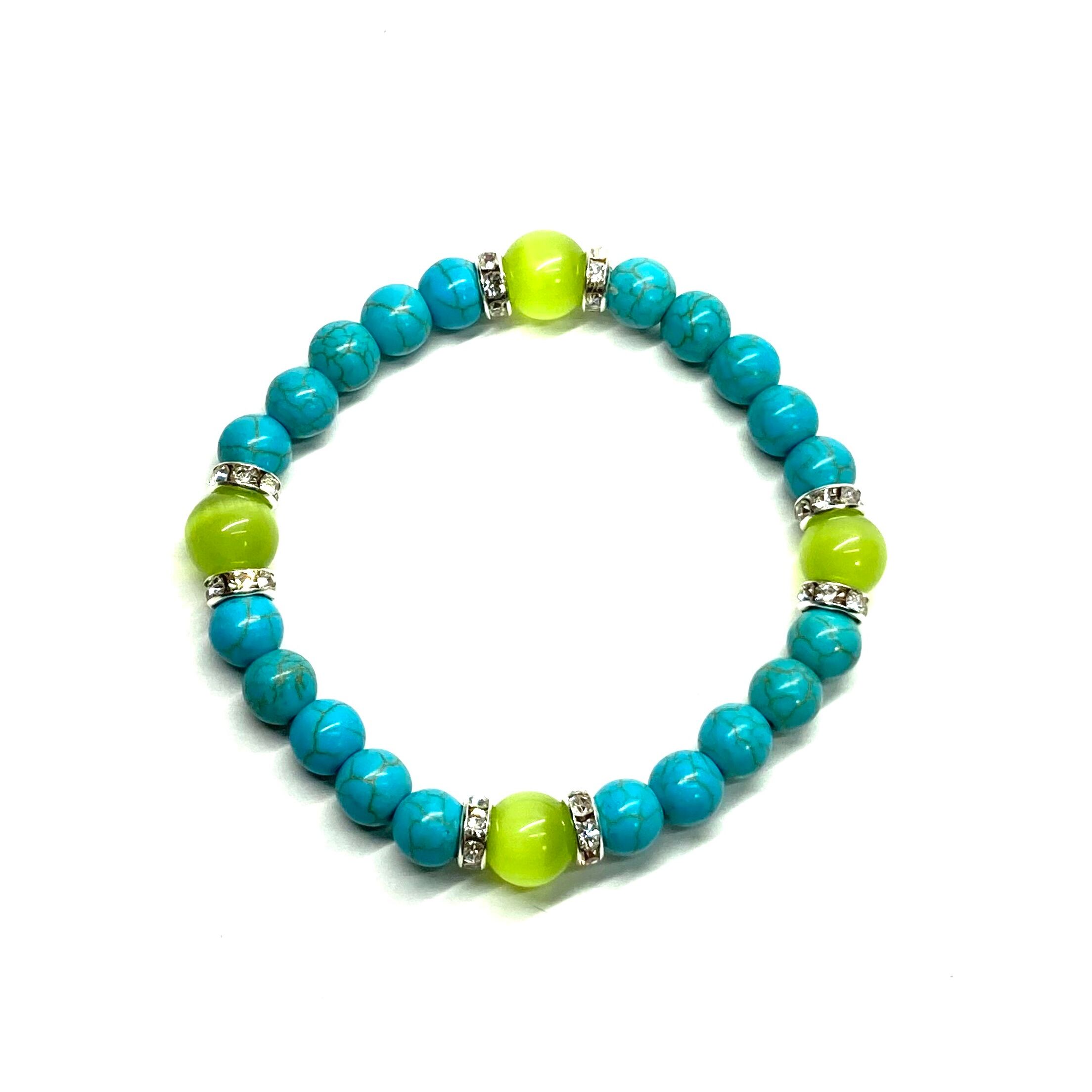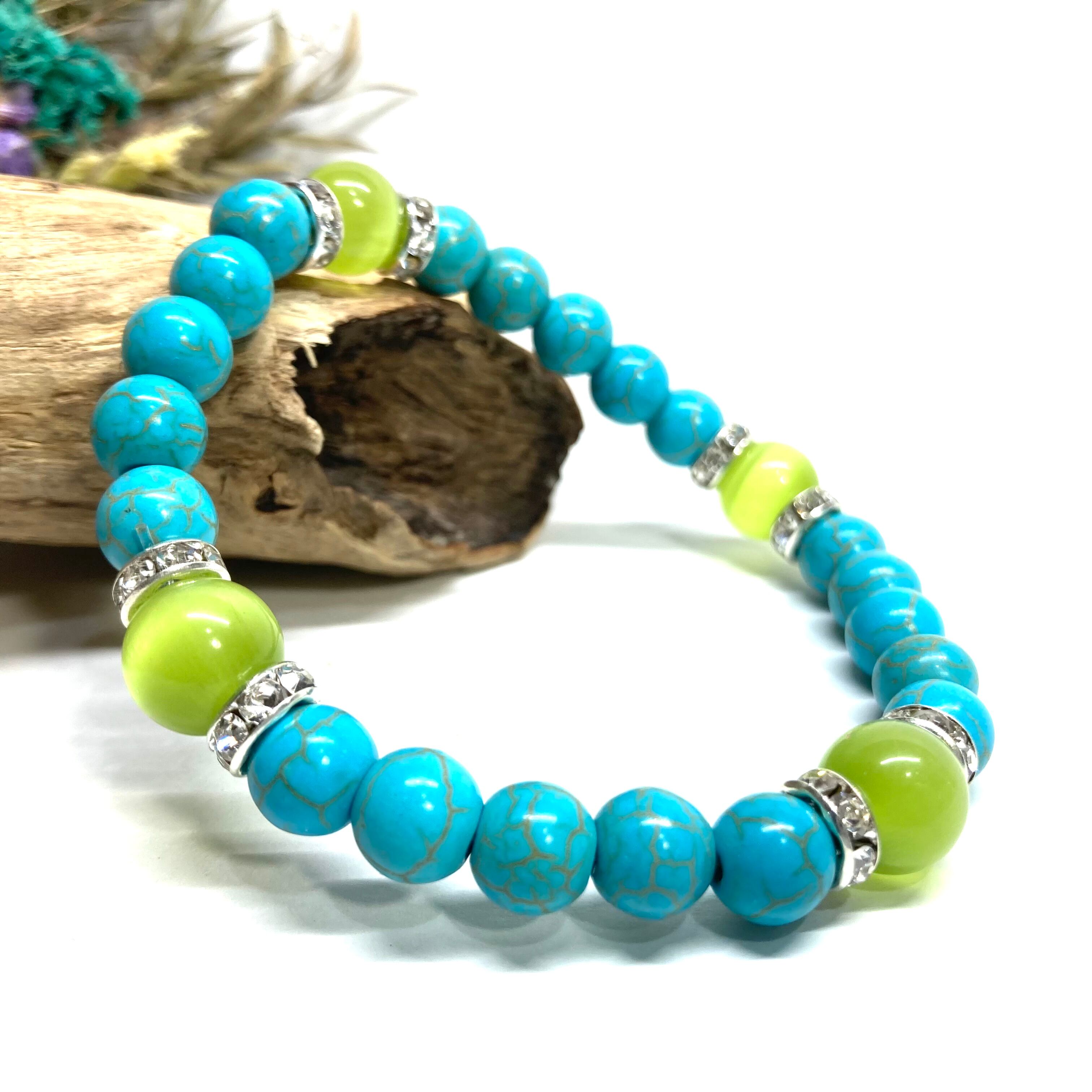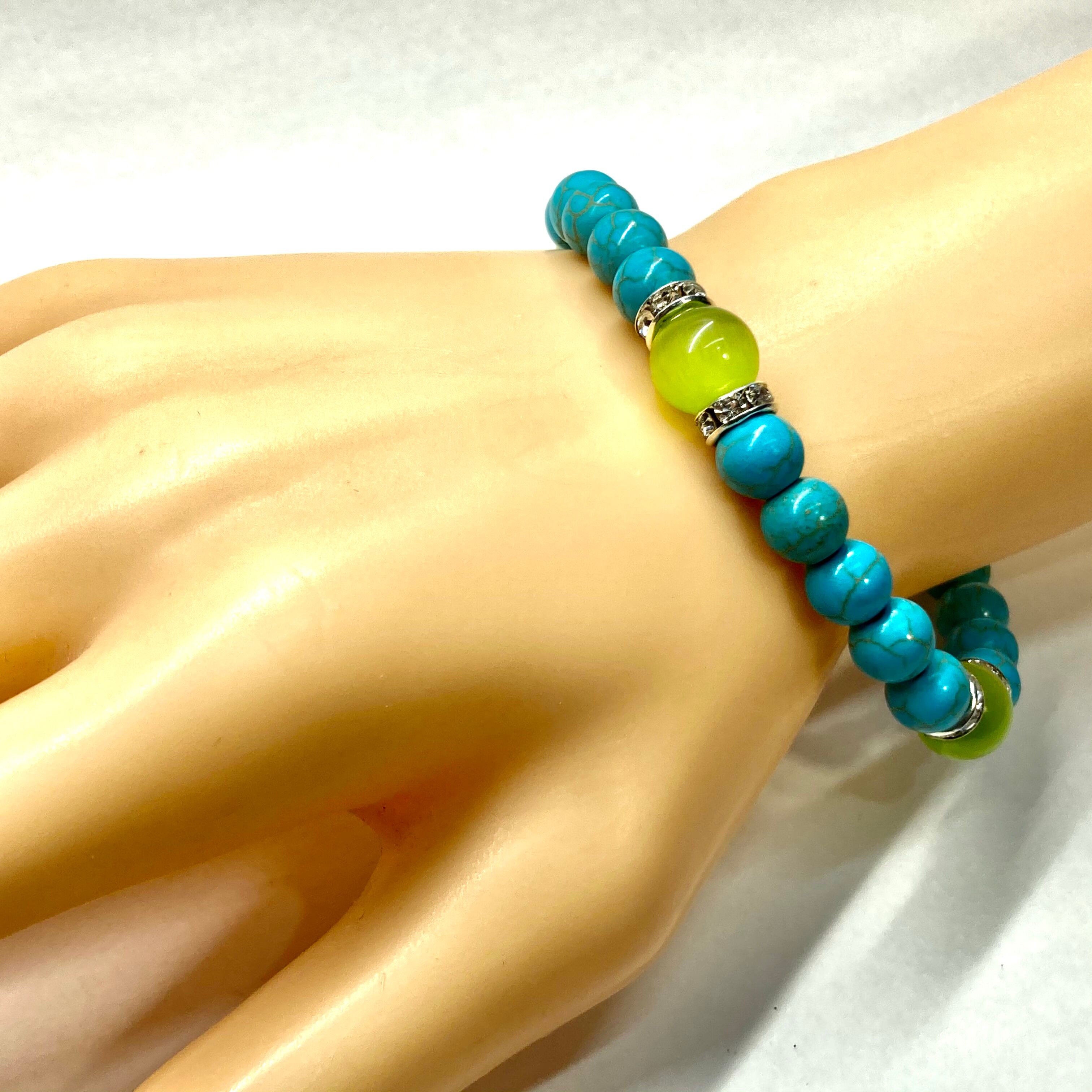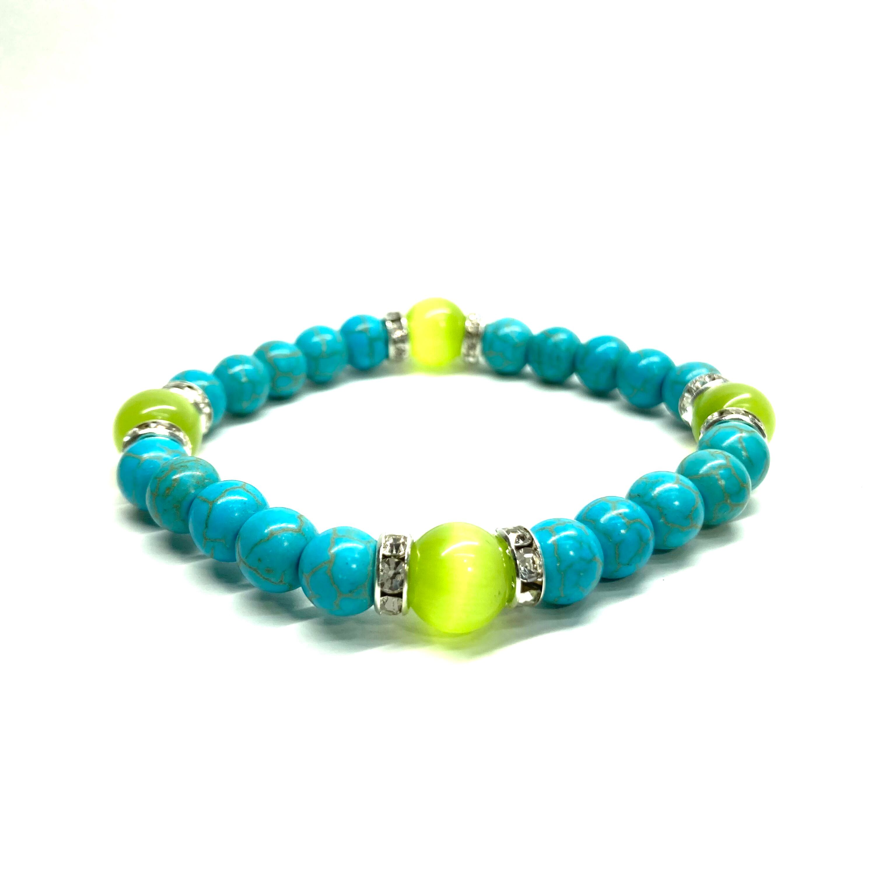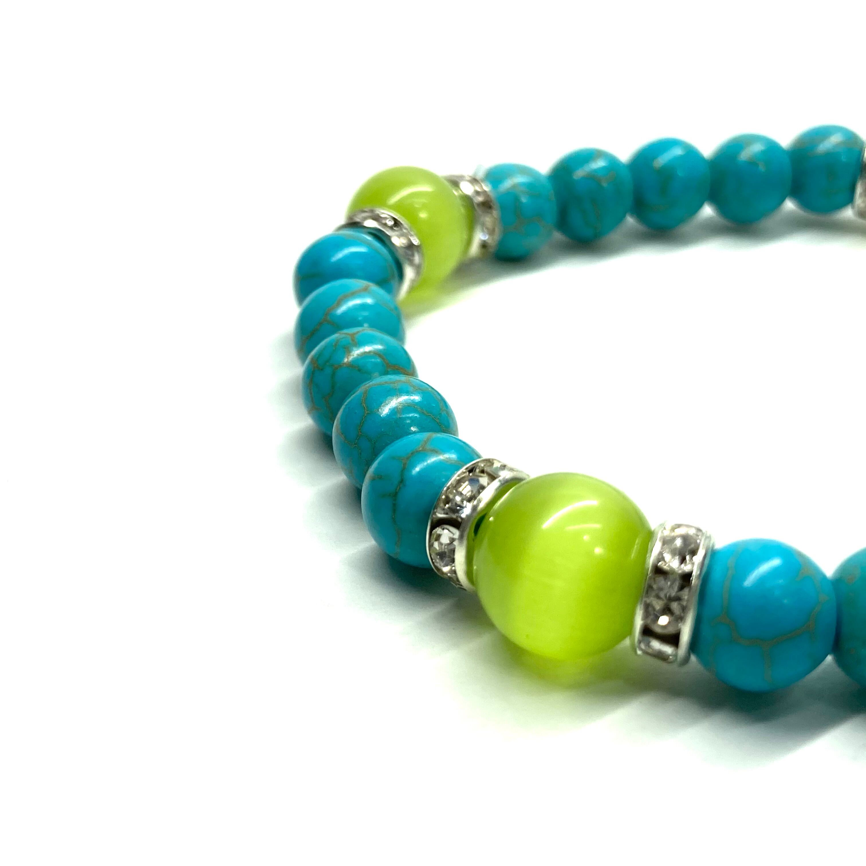 ターコイズ&キャッツアイ(ライムグリーン)パワーストーン ブレスレット (シルバー)メンズ レディース ハンドメイト