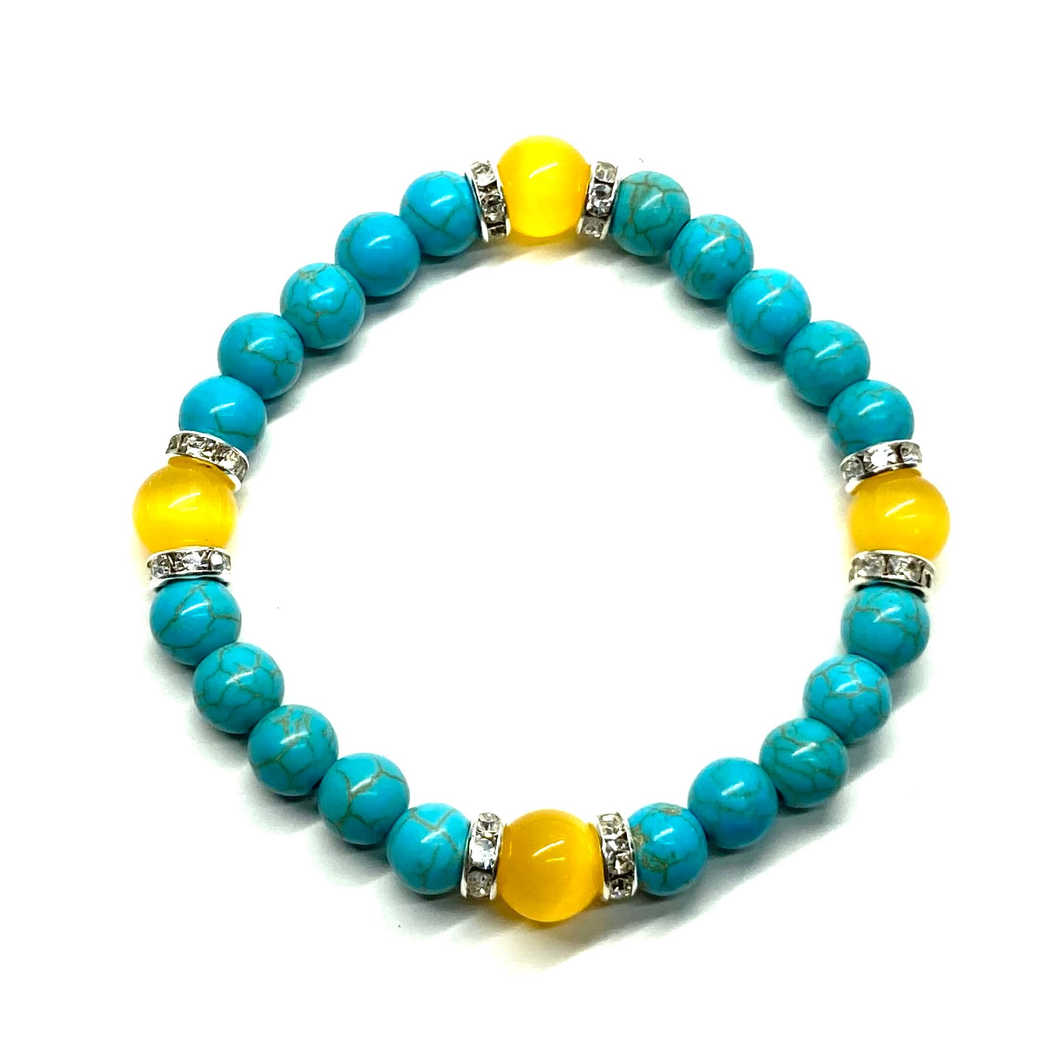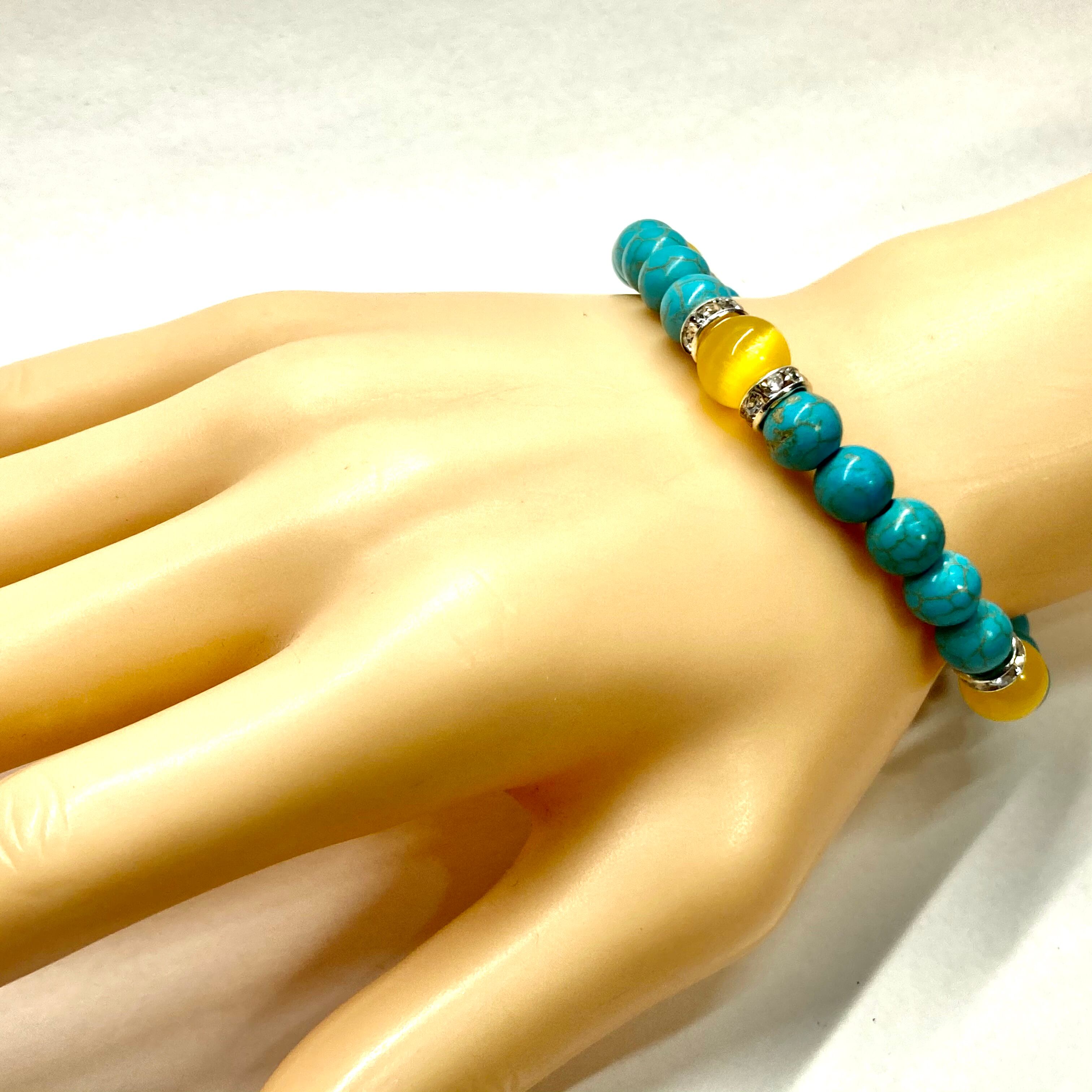 こちらは、8mm玉のキャッツアイとターコイズを使用したパワーストーンブレスレットです。間にはロンデルを挟み高級感ある大人っぽいデザインに仕上がっています。内周約17cmです。気になる方は是非この機会にどうぞ。 【ブレスレット内周サイズ】 内周約17cm 【使用している石、サイズ】 ターコイズ(8mm)・キャッツアイ(10mm) 石は全て浄化済みのものを使っています。