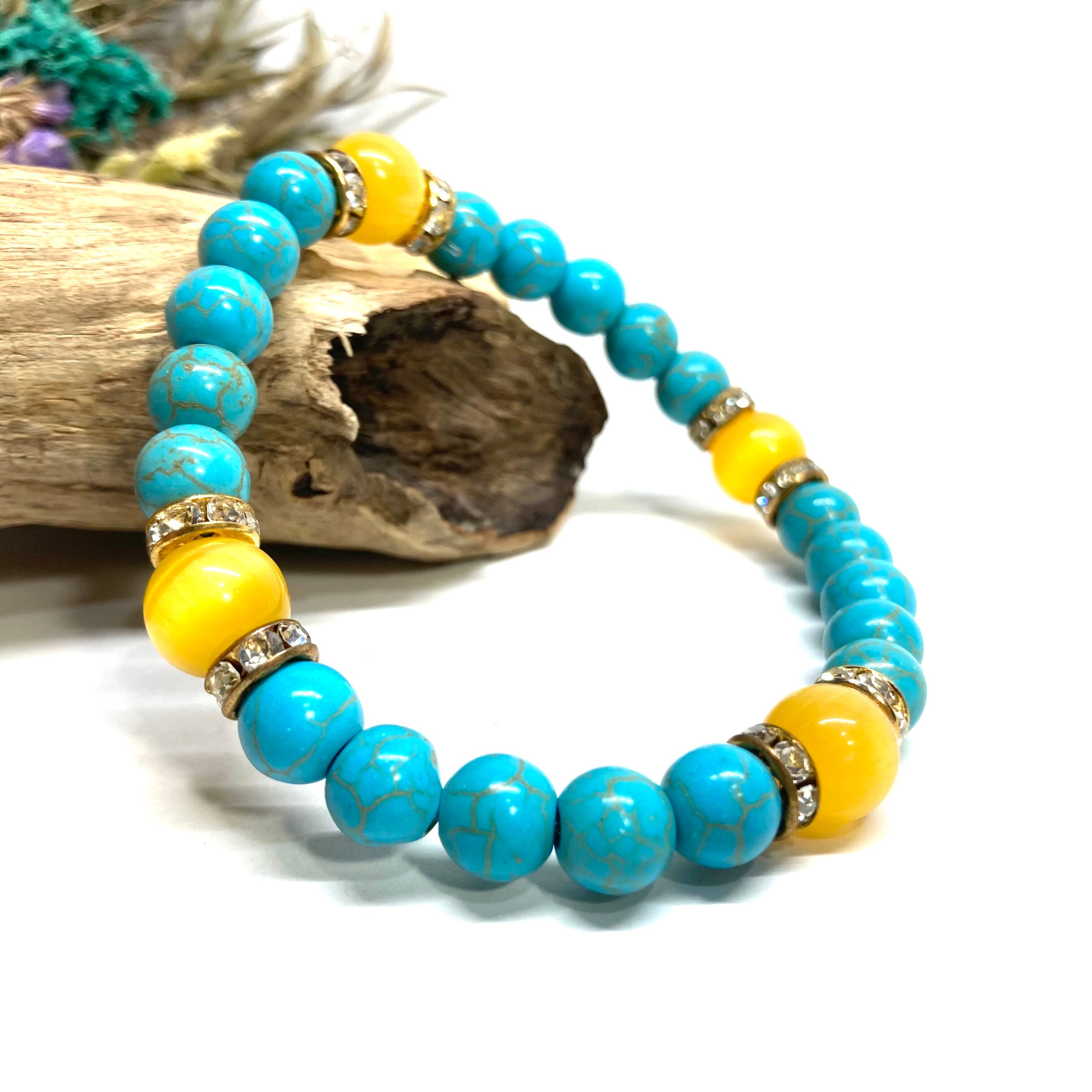 ターコイズ&キャッツアイ(イエロー) パワーストーン ブレスレット (ゴールド)メンズ レディース ハンドメイト
