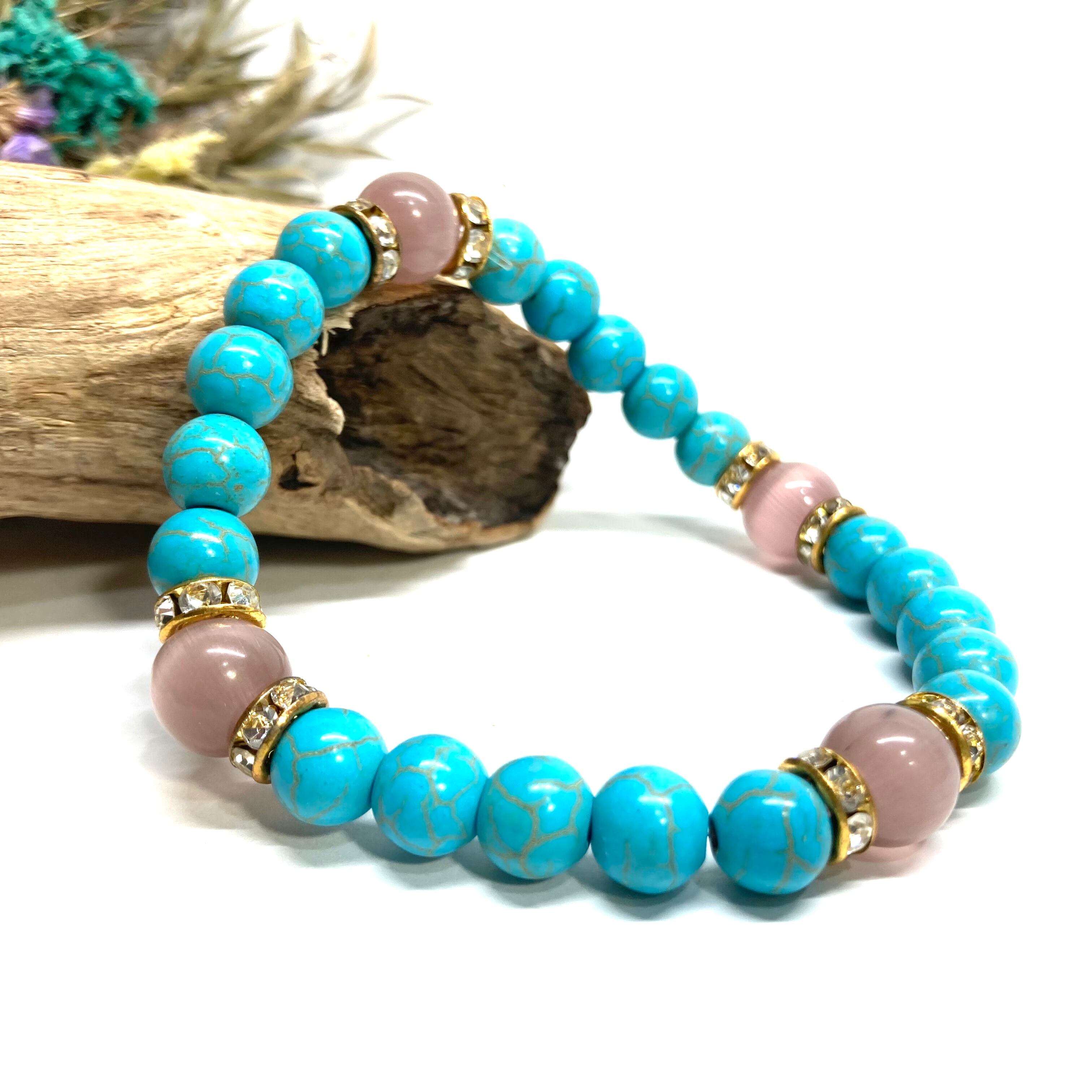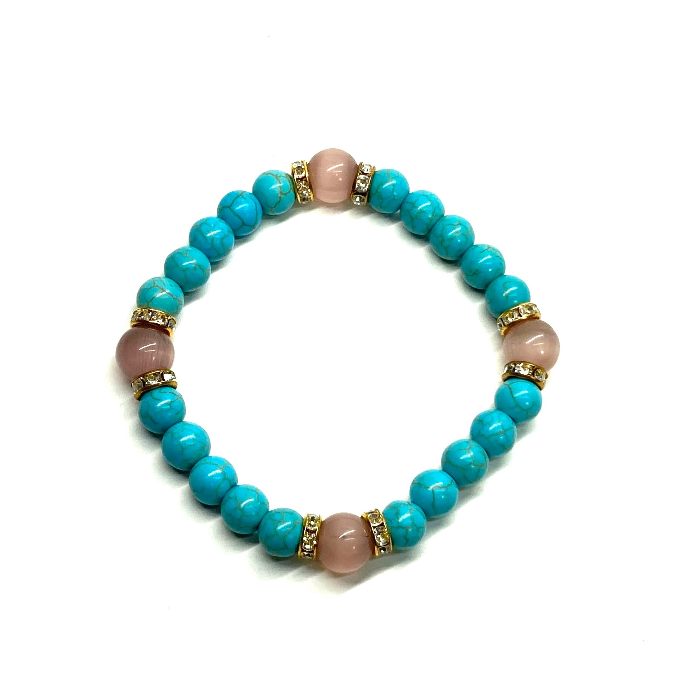 こちらは、8mm玉のキャッツアイとターコイズを使用したパワーストーンブレスレットです。間にはロンデルを挟み高級感ある大人っぽいデザインに仕上がっています。内周約17cmです。気になる方は是非この機会にどうぞ。 【ブレスレット内周サイズ】 内周約17cm 【使用している石、サイズ】 ターコイズ(8mm)・キャッツアイ(10mm) 石は全て浄化済みのものを使っています。