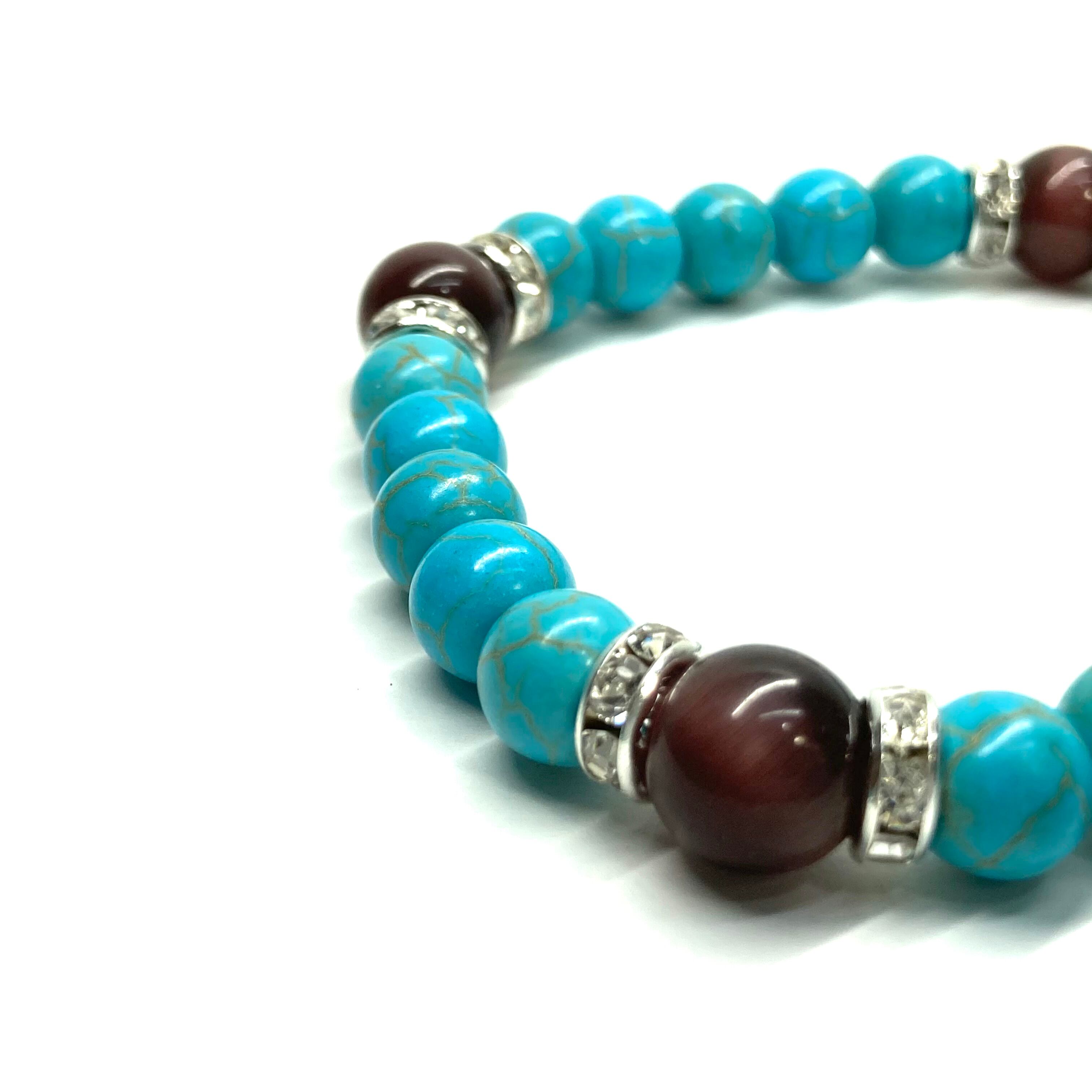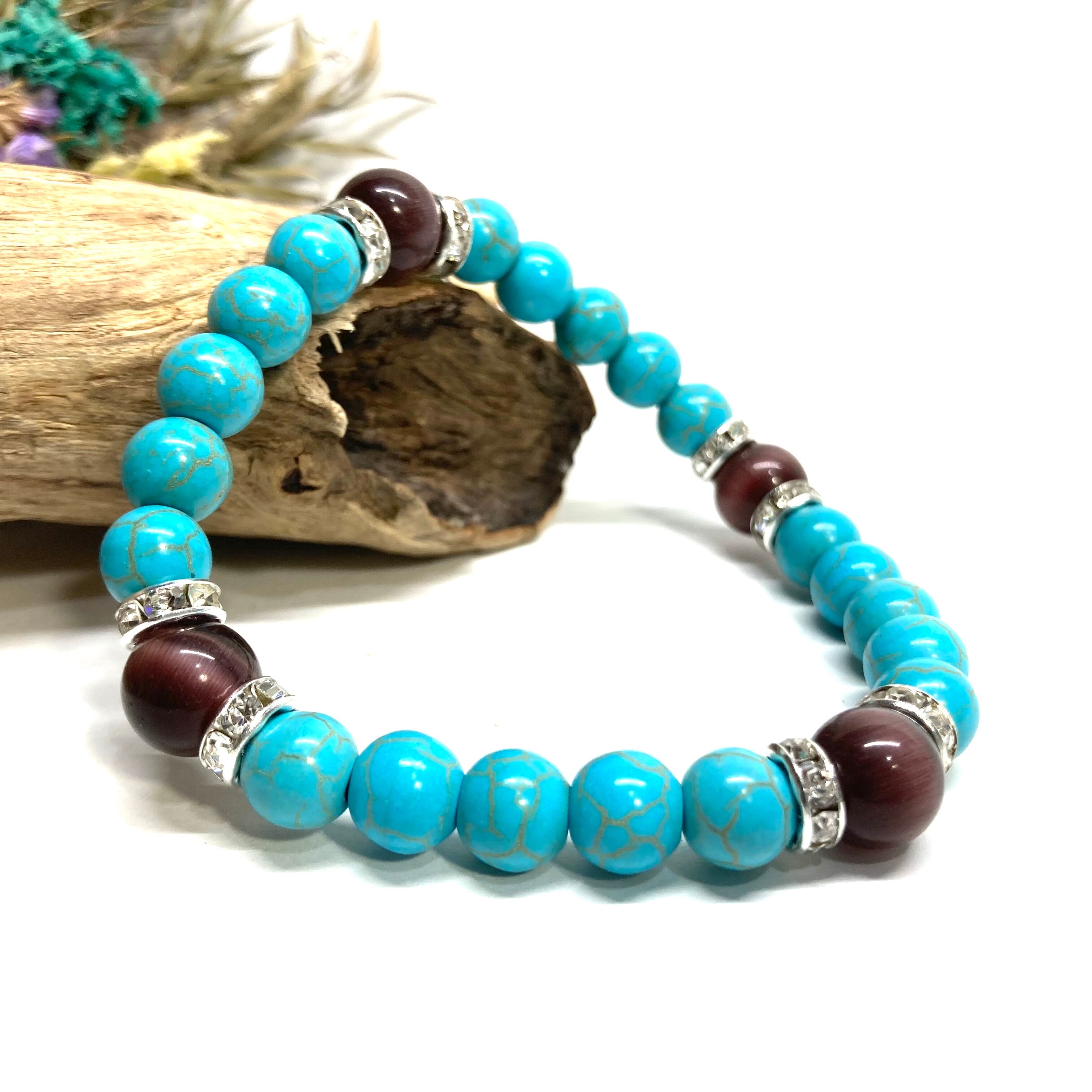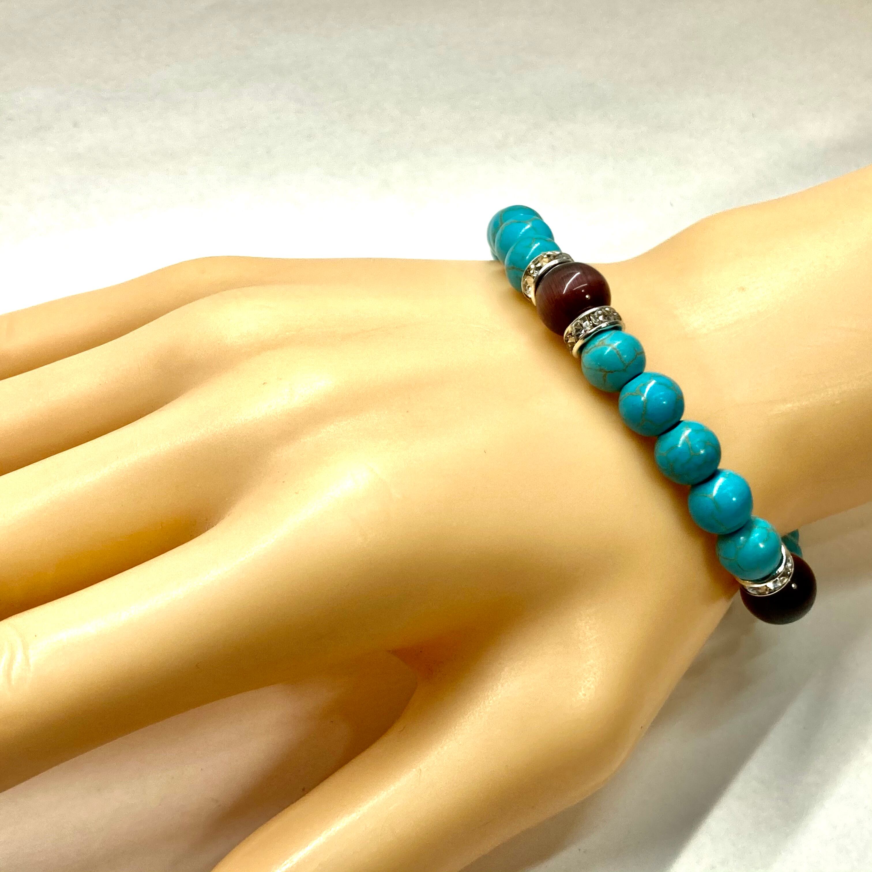 こちらは、8mm玉のキャッツアイとターコイズを使用したパワーストーンブレスレットです。間にはロンデルを挟み高級感ある大人っぽいデザインに仕上がっています。内周約17cmです。気になる方は是非この機会にどうぞ。 【ブレスレット内周サイズ】 内周約17cm 【使用している石、サイズ】 ターコイズ(8mm)・キャッツアイ(10mm) 石は全て浄化済みのものを使っています。