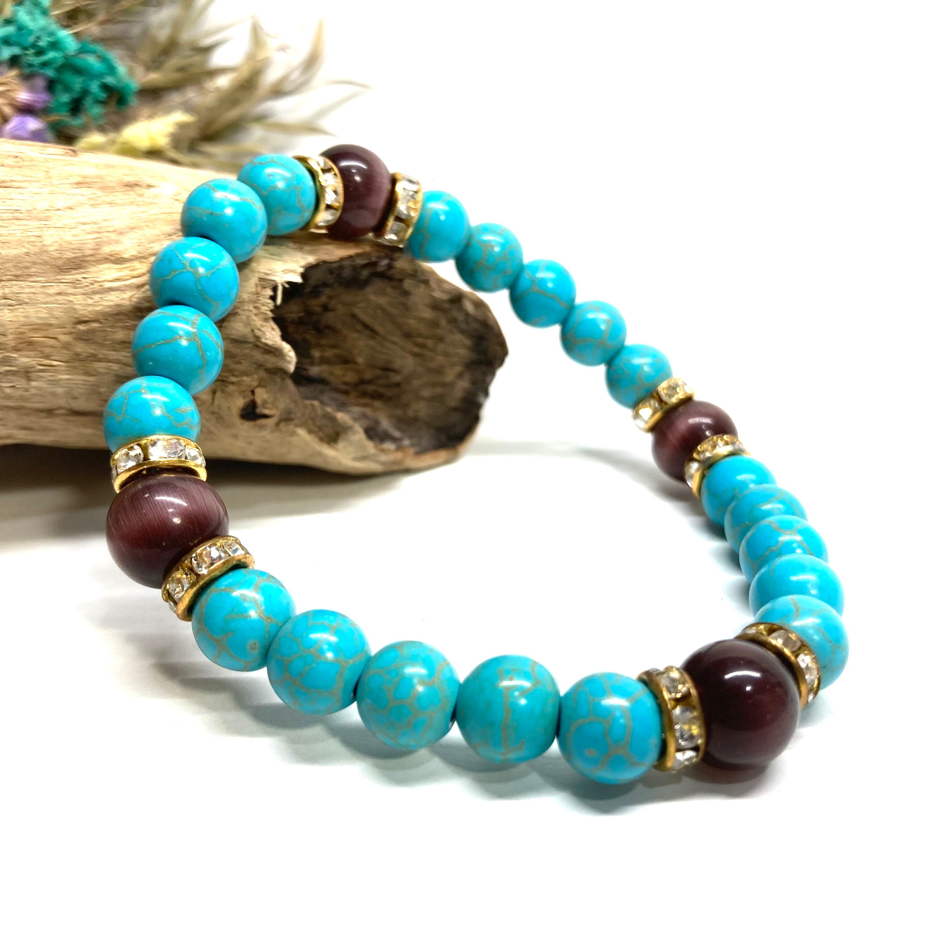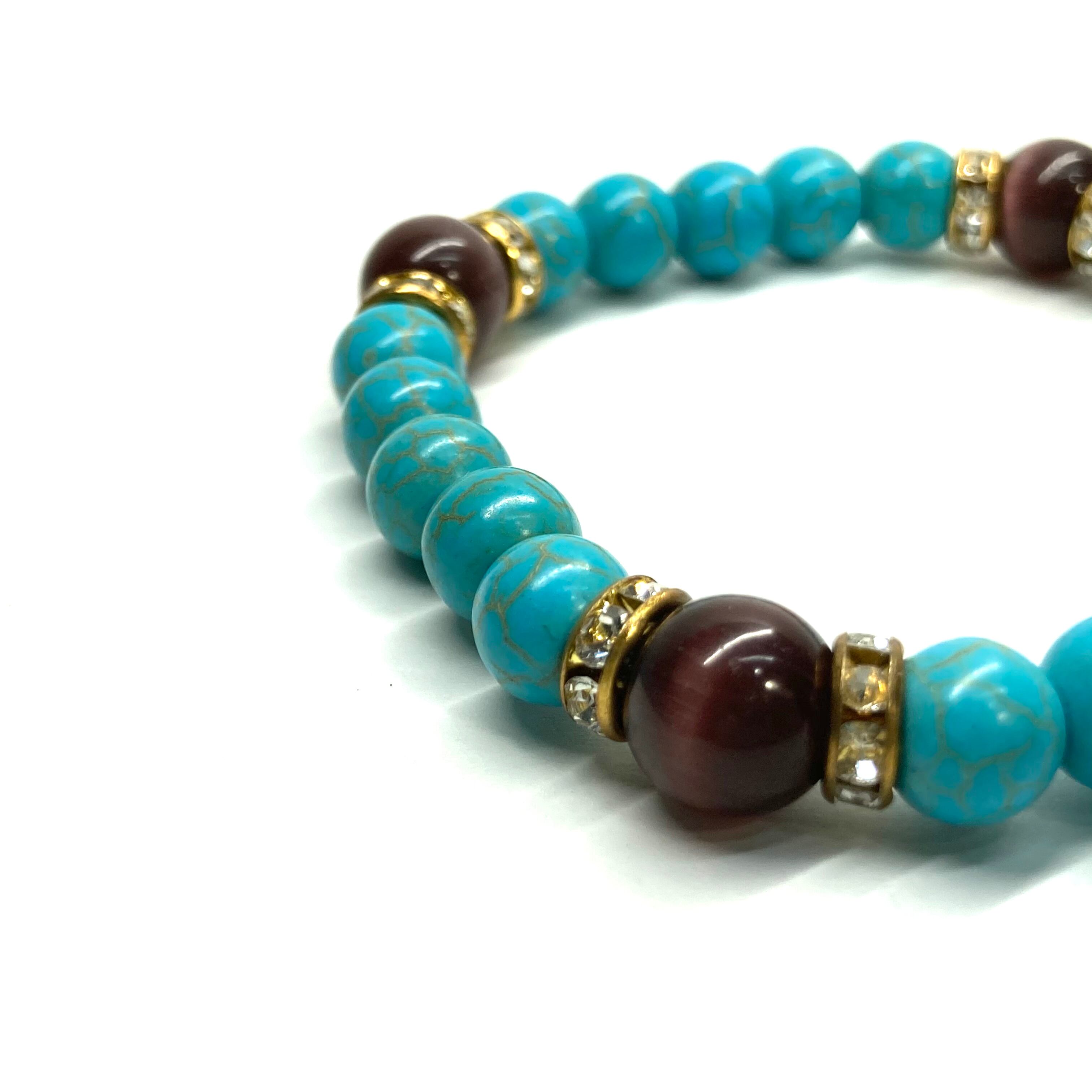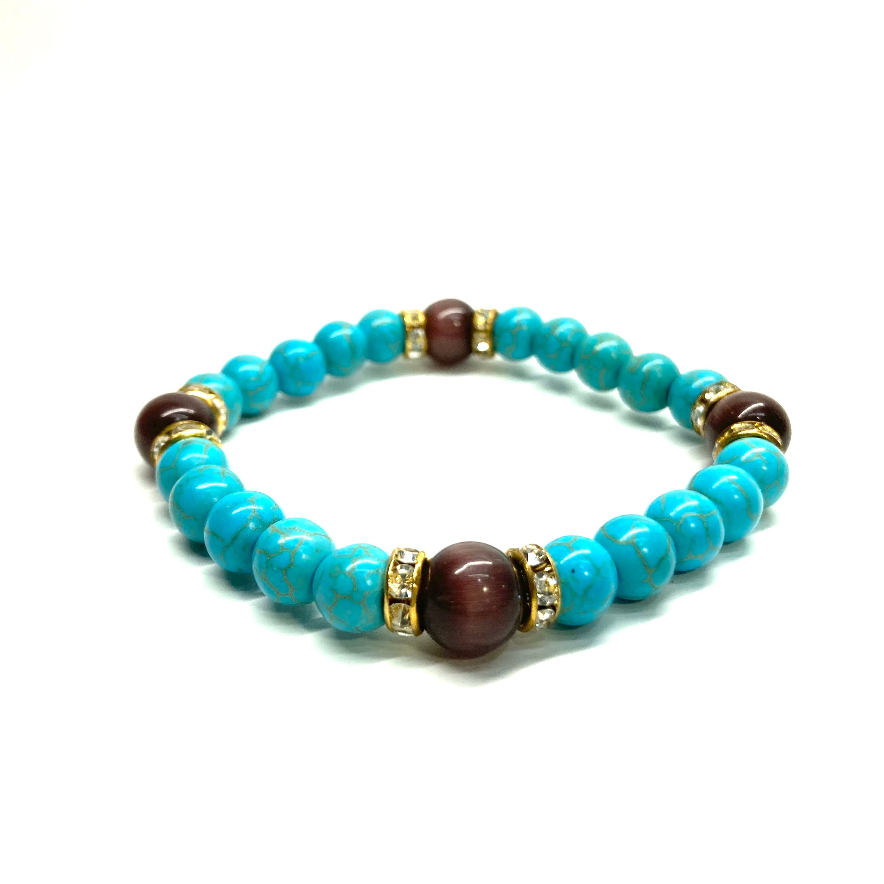 こちらは、8mm玉のキャッツアイとターコイズを使用したパワーストーンブレスレットです。間にはロンデルを挟み高級感ある大人っぽいデザインに仕上がっています。内周約17cmです。気になる方は是非この機会にどうぞ。 【ブレスレット内周サイズ】 内周約17cm 【使用している石、サイズ】 ターコイズ(8mm)・キャッツアイ(10mm) 石は全て浄化済みのものを使っています。