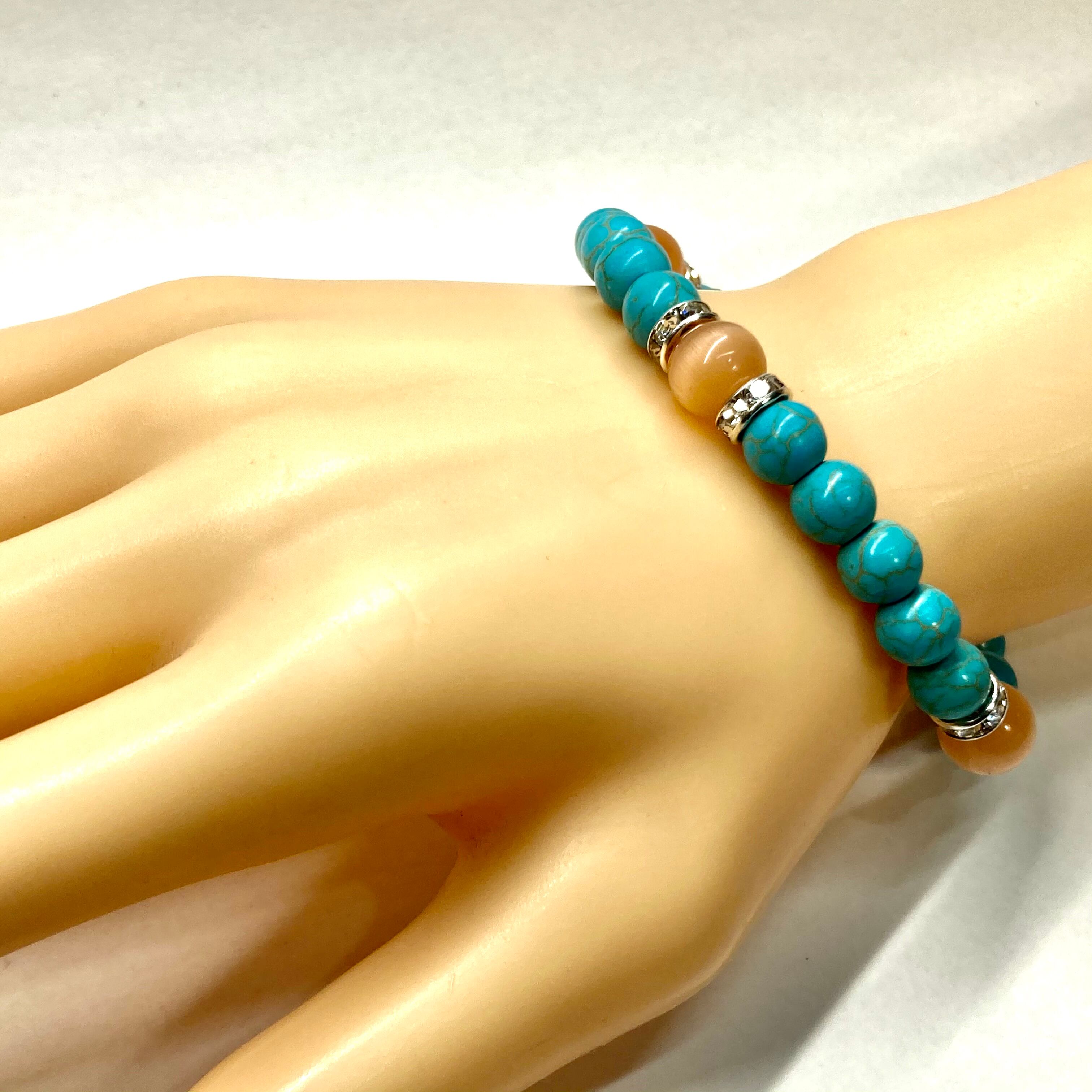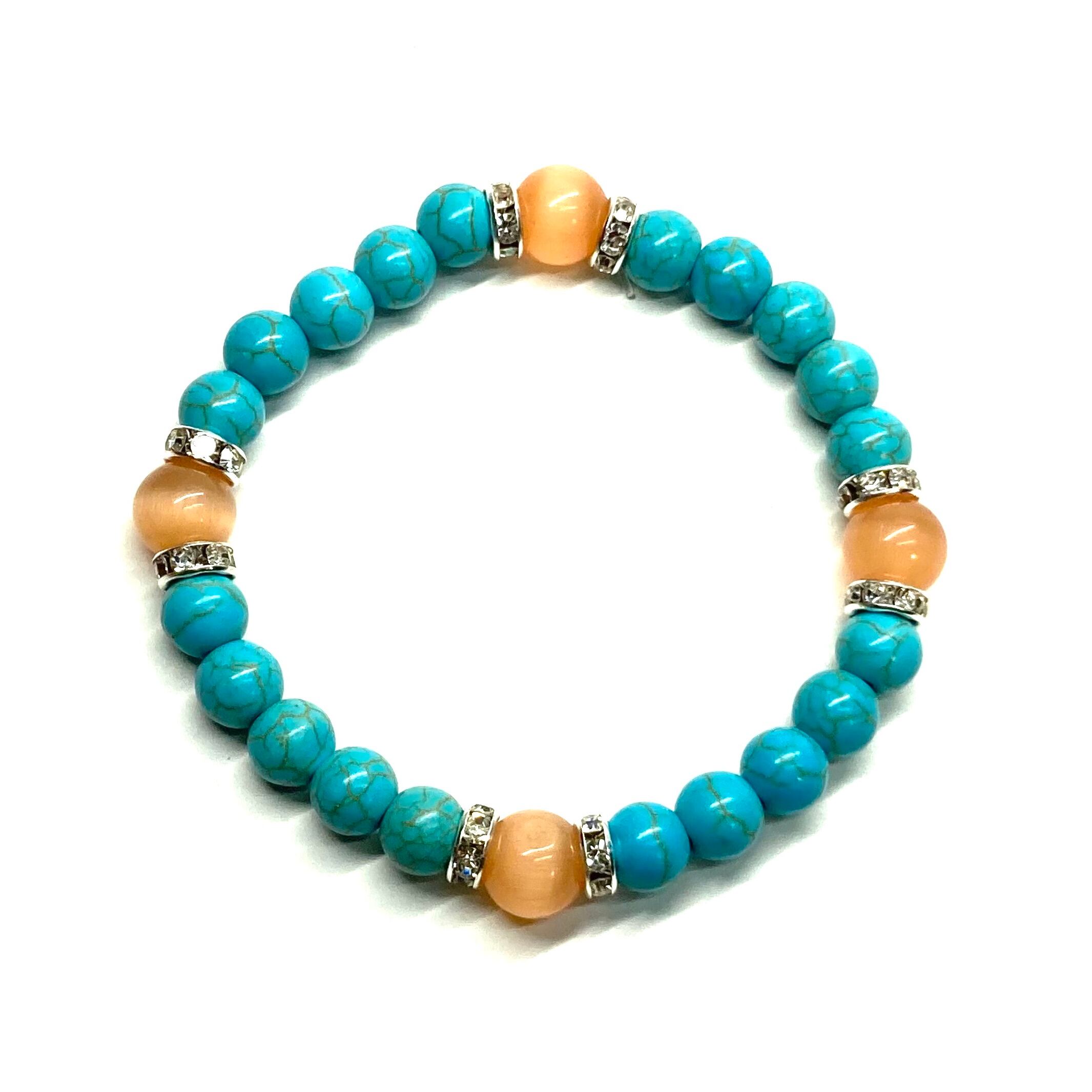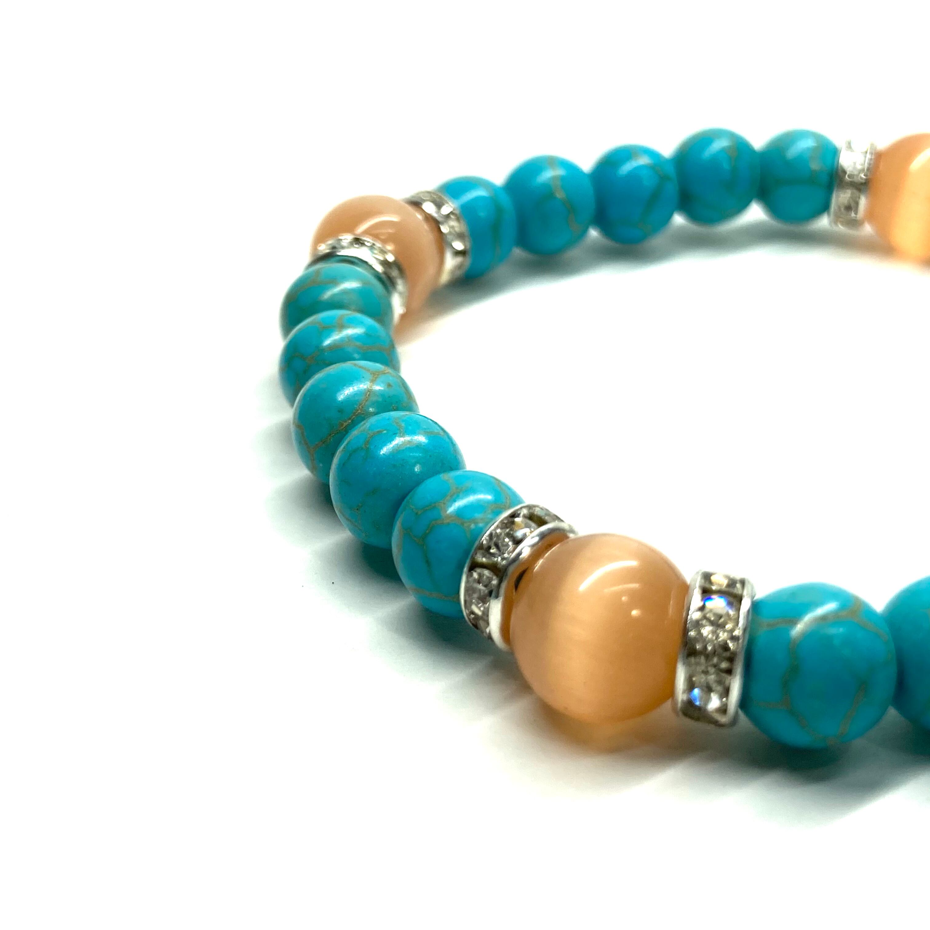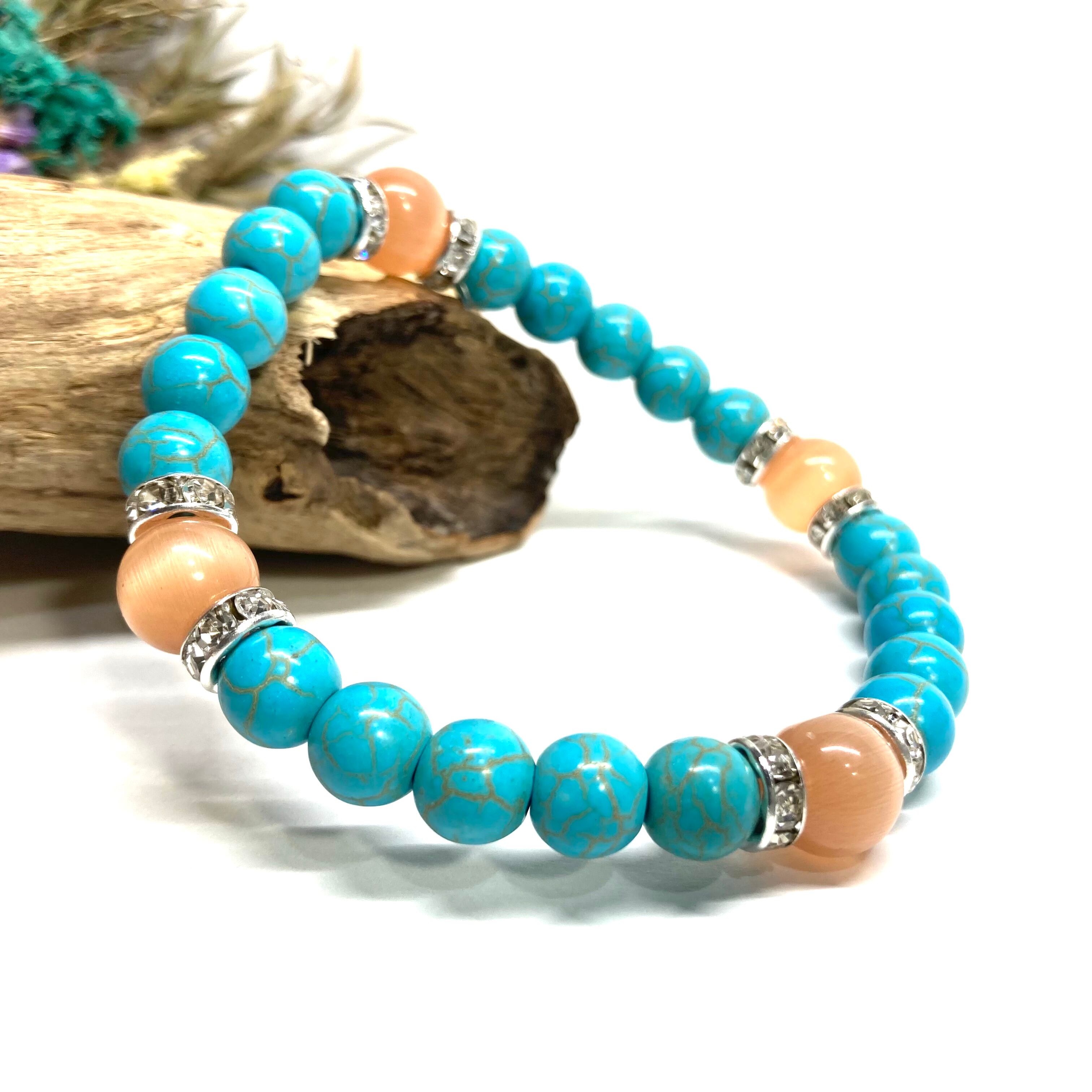 こちらは、8mm玉のキャッツアイとターコイズを使用したパワーストーンブレスレットです。間にはロンデルを挟み高級感ある大人っぽいデザインに仕上がっています。内周約17cmです。気になる方は是非この機会にどうぞ。 【ブレスレット内周サイズ】 内周約17cm 【使用している石、サイズ】 ターコイズ(8mm)・キャッツアイ(10mm) 石は全て浄化済みのものを使っています。