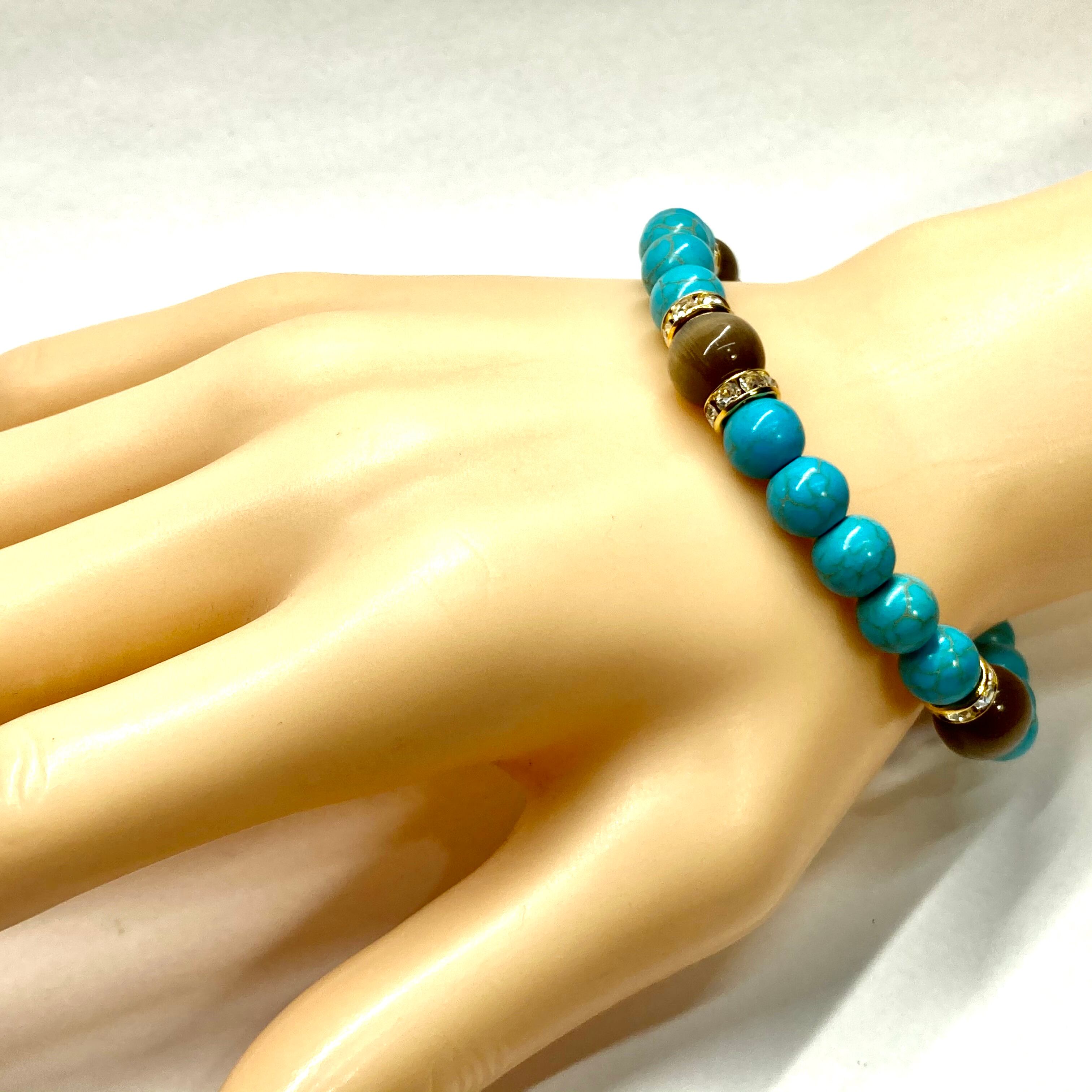 こちらは、8mm玉のキャッツアイとターコイズを使用したパワーストーンブレスレットです。間にはロンデルを挟み高級感ある大人っぽいデザインに仕上がっています。内周約17cmです。気になる方は是非この機会にどうぞ。 【ブレスレット内周サイズ】 内周約17cm 【使用している石、サイズ】 ターコイズ(8mm)・キャッツアイ(10mm) 石は全て浄化済みのものを使っています。