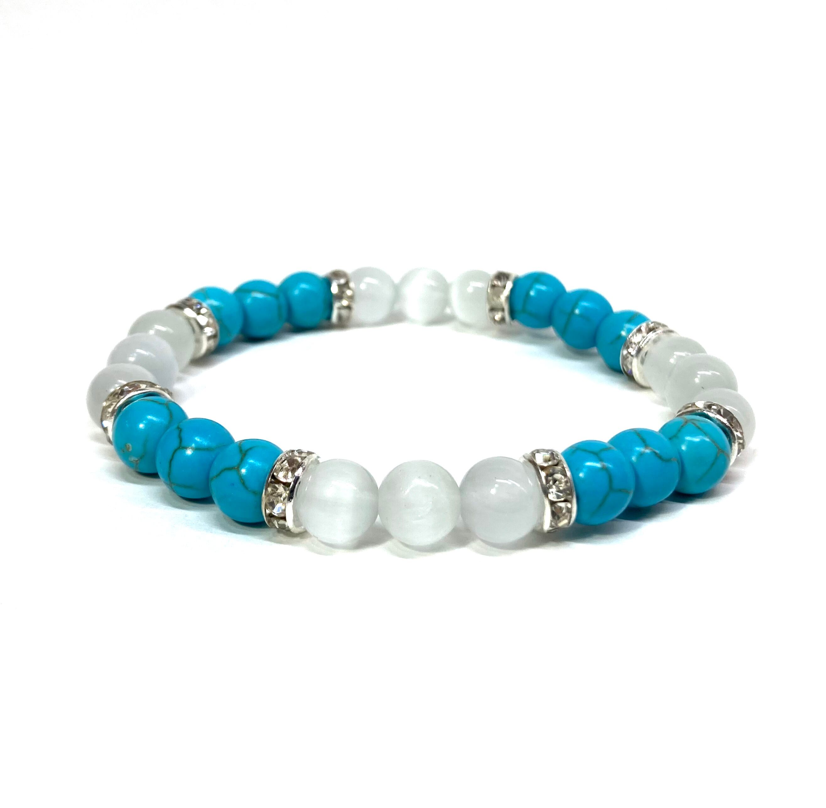 こちらは、8mm玉のキャッツアイとターコイズを使用したパワーストーンブレスレットです。間にはロンデルを挟み高級感ある大人っぽいデザインに仕上がっています。内周約16cmです。気になる方は是非この機会にどうぞ。 【ブレスレット内周サイズ】 内周約16cm 【使用している石、サイズ】 ターコイズ(8mm)・キャッツアイ(8mm) 石は全て浄化済みのものを使っています。