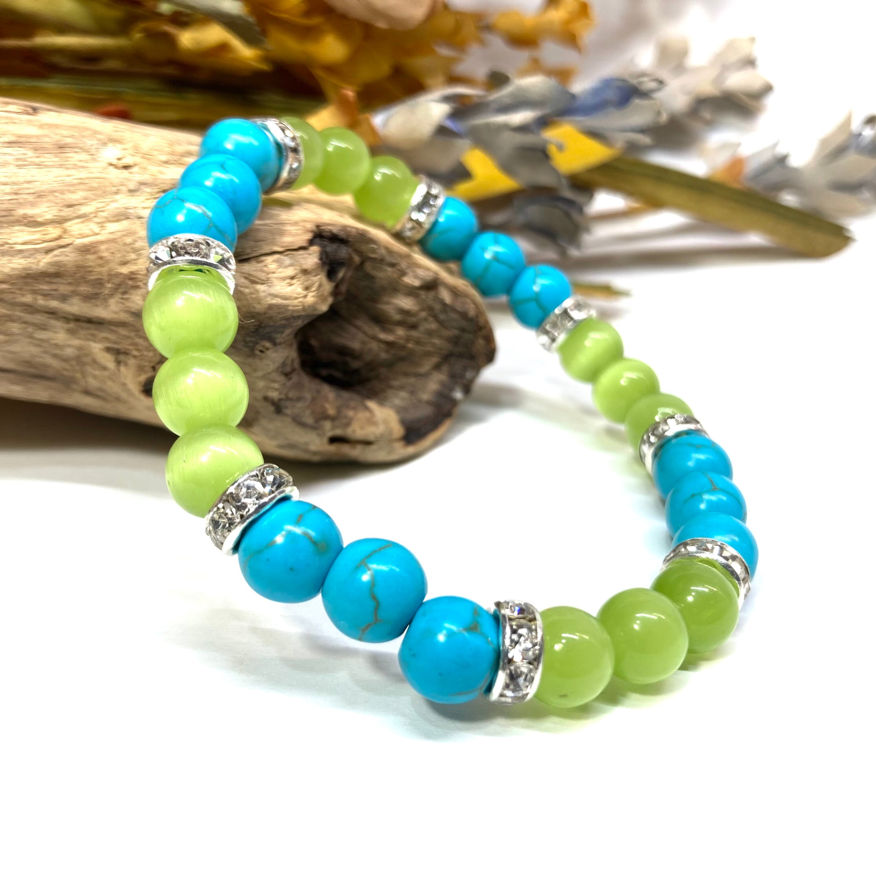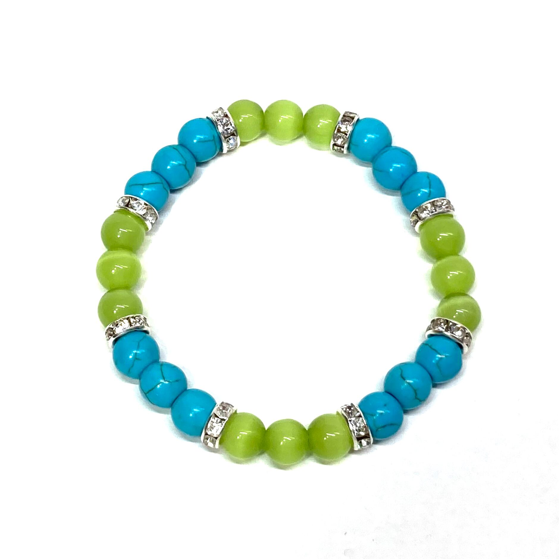ターコイズ&キャッツアイ(ライムグリーン) パワーストーン ブレスレット (シルバー)メンズ レディース ハンドメイト