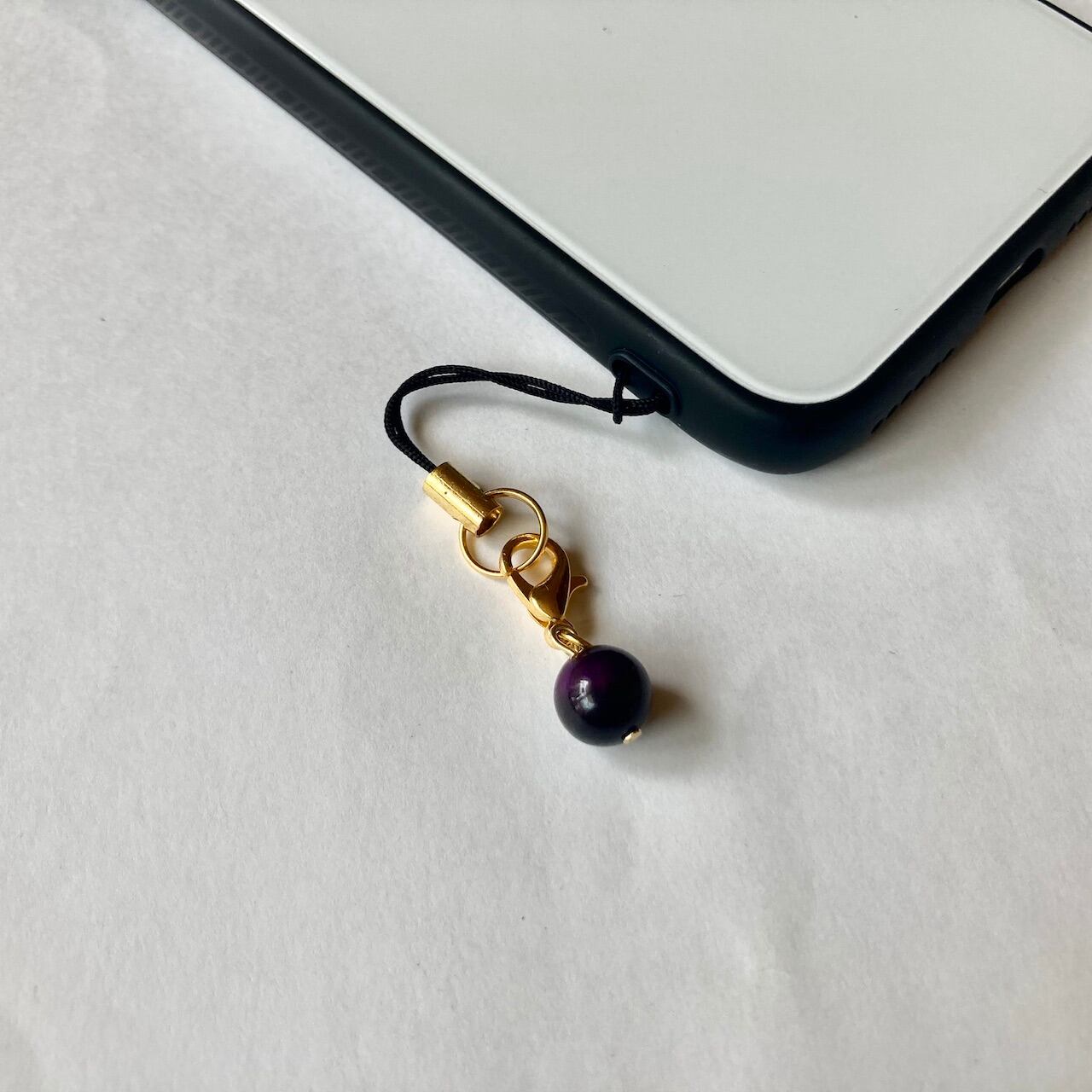 こちらは、8mm玉のパープルタイガーアイを使用した一粒ストラップです。携帯電話にそのまま付けたり、ストラップから取り外しできるデザインに制作しておりますので、ストラップから外してお財布やポーチに付けたり、マスクチャームとも使えるデザインに仕上げています。気になる方は是非この機会にどうぞ。