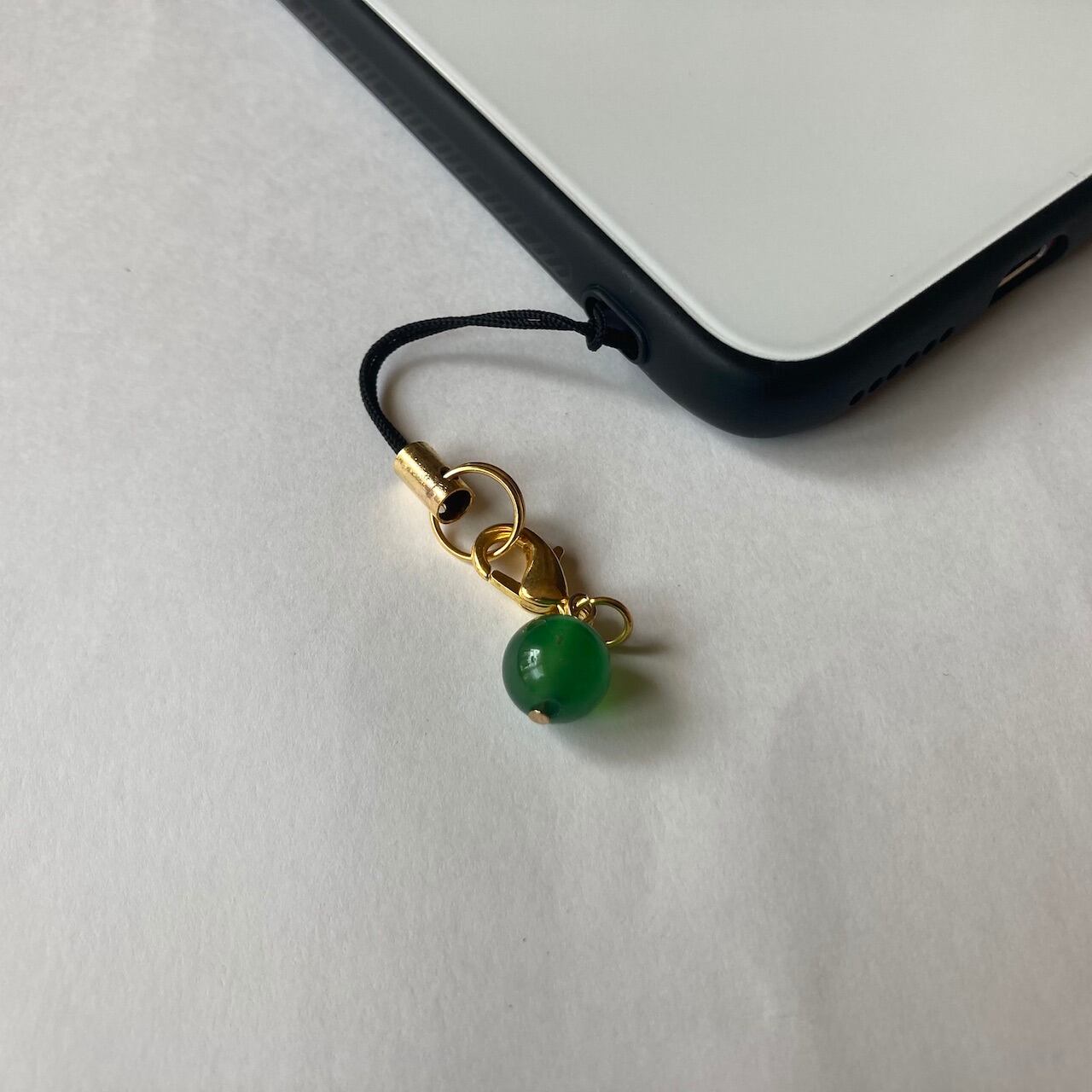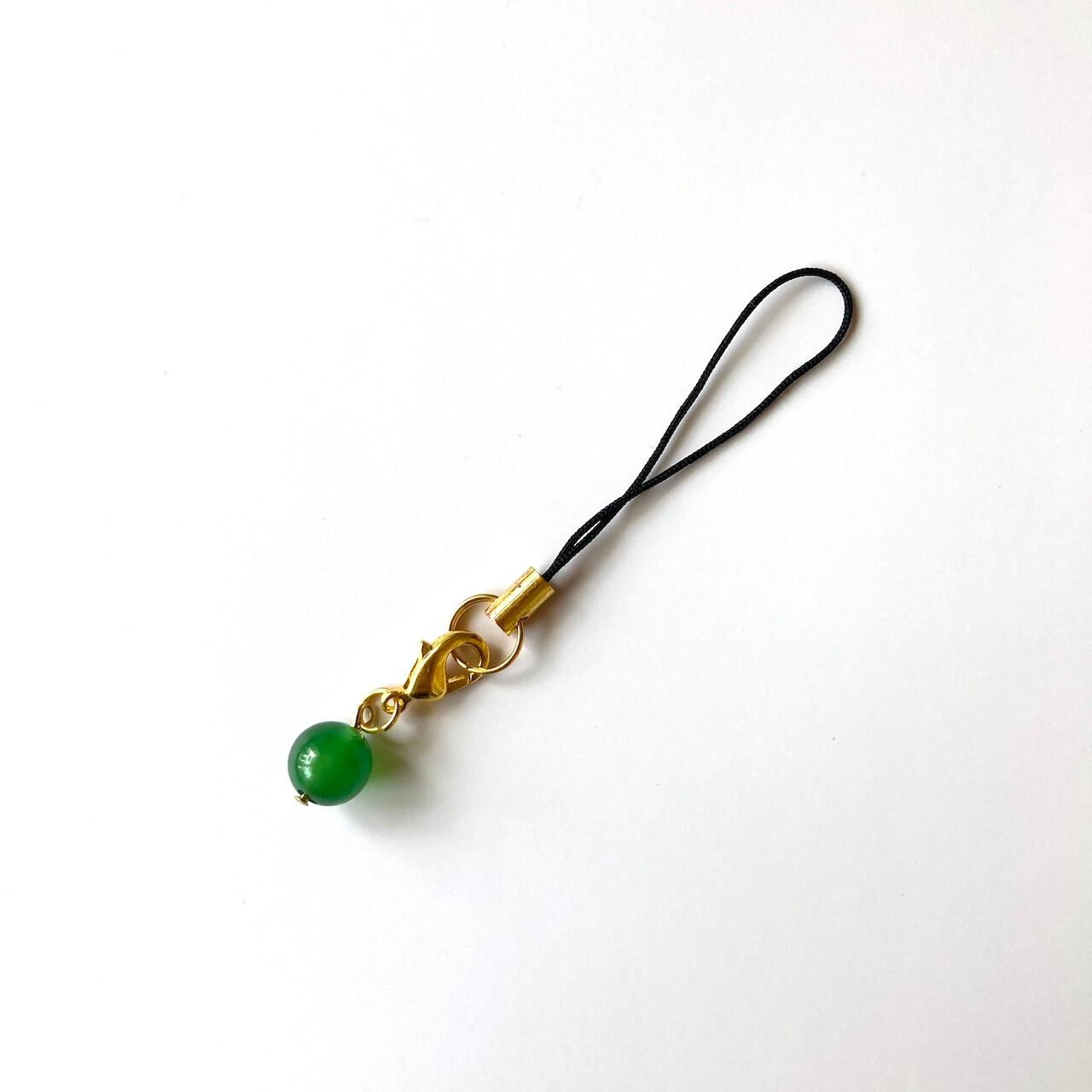 こちらは、8mm玉の緑瑪瑙を使用した一粒ストラップです。携帯電話にそのまま付けたり、ストラップから取り外しできるデザインに制作しておりますので、ストラップから外してお財布やポーチに付けたり、マスクチャームとも使えるデザインに仕上げています。気になる方は是非この機会にどうぞ。