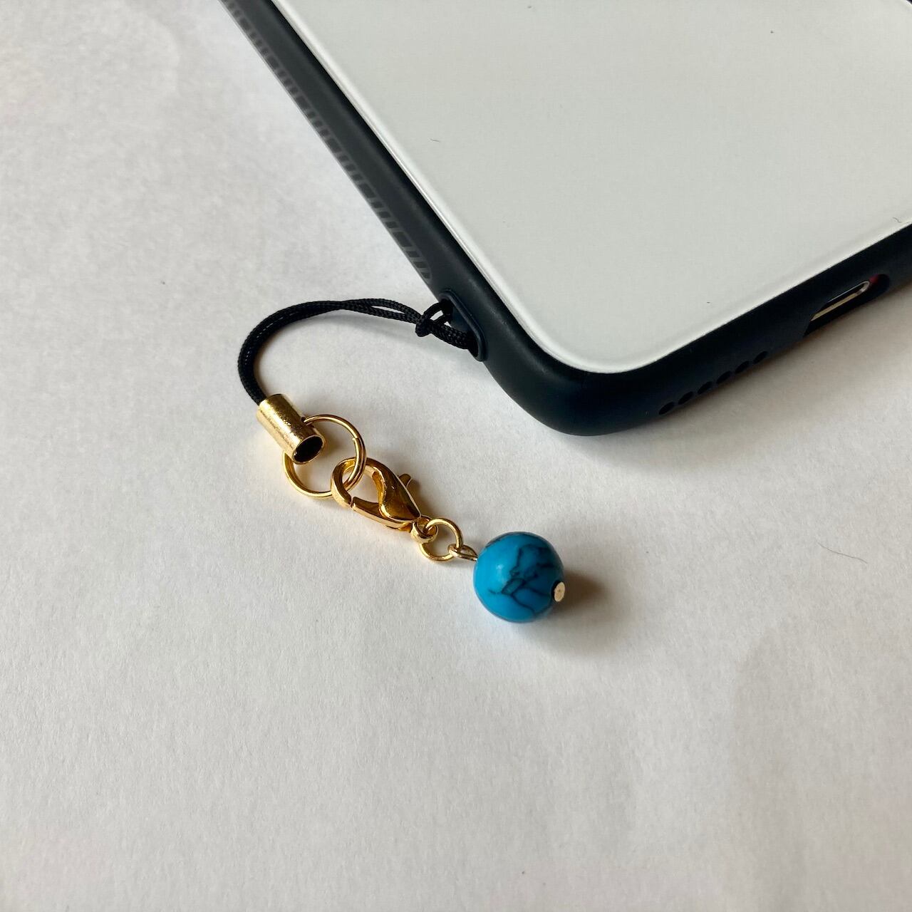 こちらは、8mm玉のターコイズを使用した一粒ストラップです。携帯電話にそのまま付けたり、ストラップから取り外しできるデザインに制作しておりますので、ストラップから外してお財布やポーチに付けたり、マスクチャームとも使えるデザインに仕上げています。気になる方は是非この機会にどうぞ。