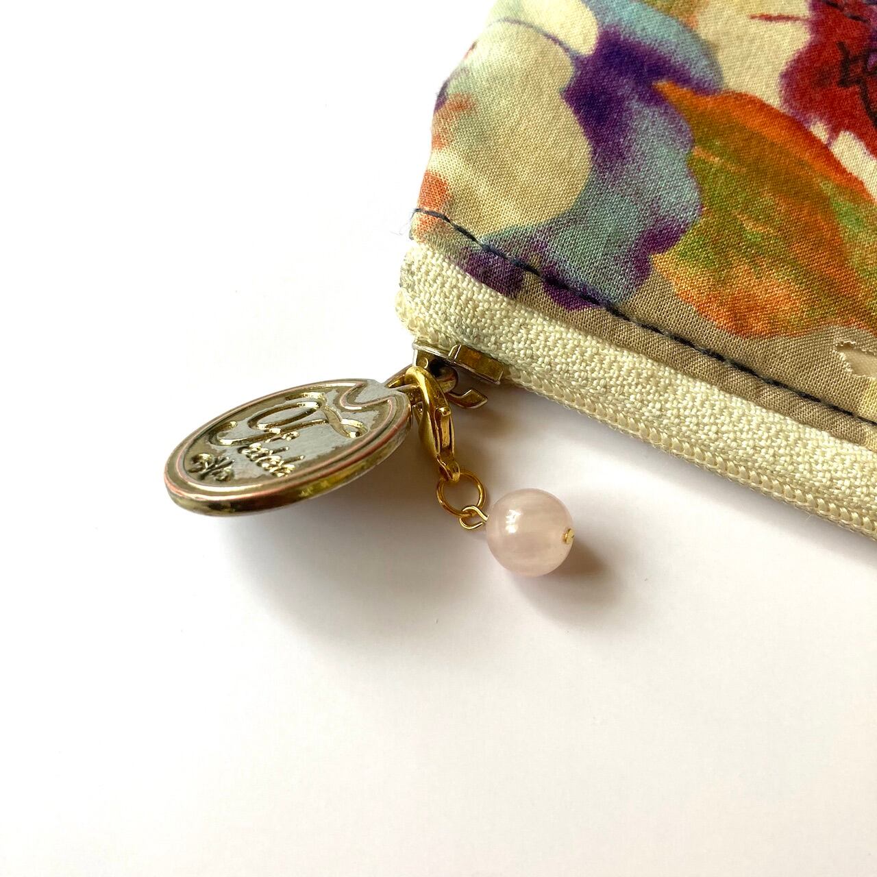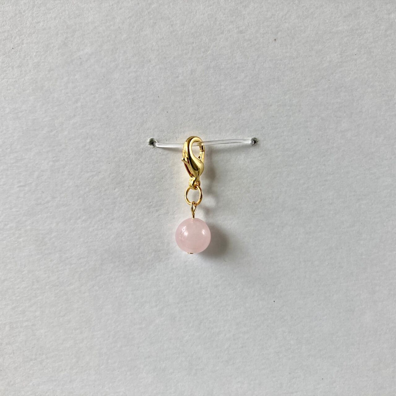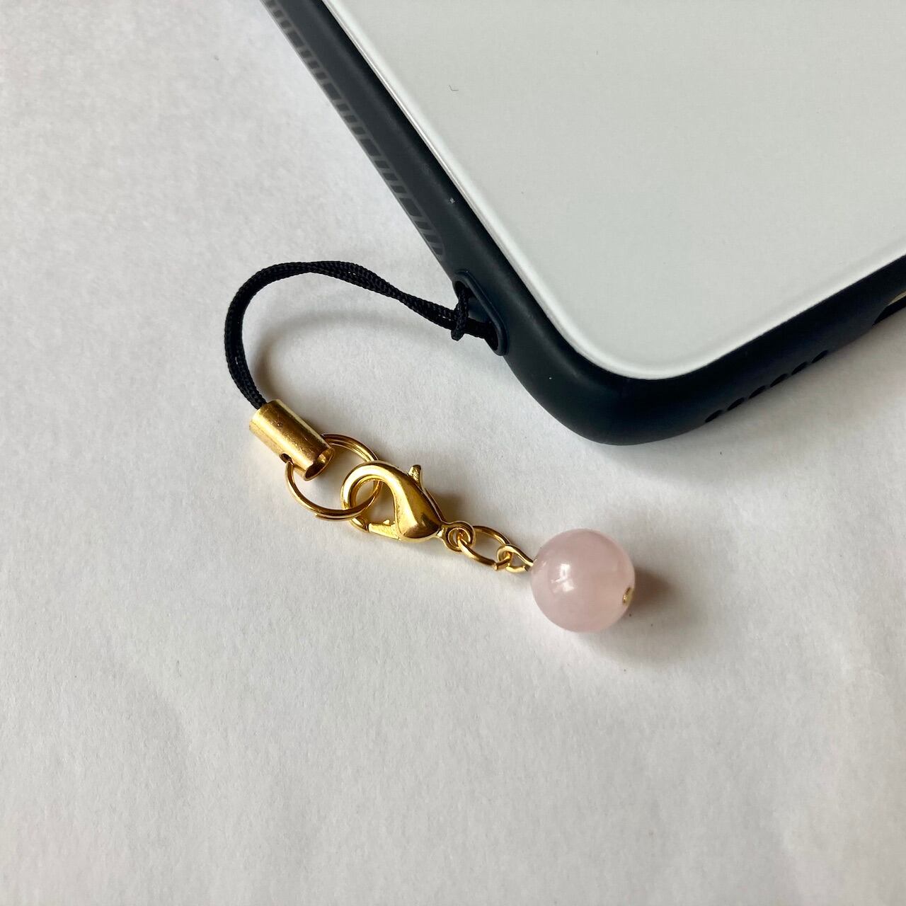 こちらは、8mm玉のローズクォーツを使用した一粒ストラップです。携帯電話にそのまま付けたり、ストラップから取り外しできるデザインに制作しておりますので、ストラップから外してお財布やポーチに付けたり、マスクチャームとも使えるデザインに仕上げています。気になる方は是非この機会にどうぞ。