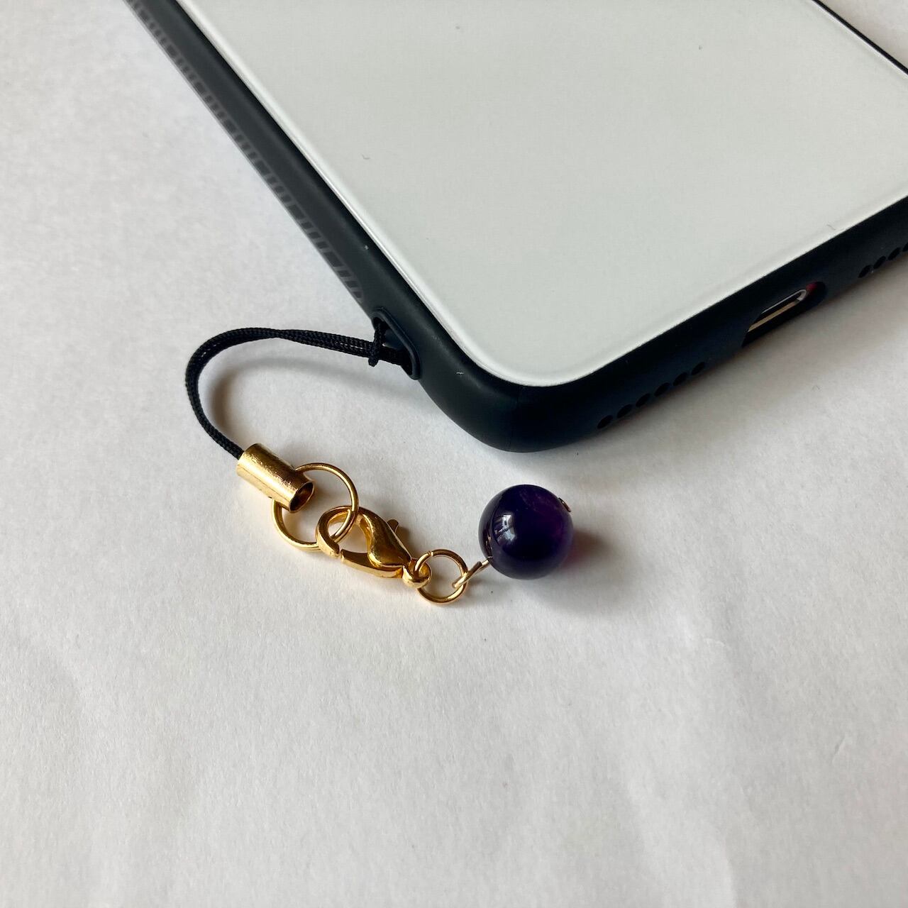 こちらは、8mm玉のアメジストを使用した一粒ストラップです。携帯電話にそのまま付けたり、ストラップから取り外しできるデザインに制作しておりますので、ストラップから外してお財布やポーチに付けたり、マスクチャームとも使えるデザインに仕上げています。気になる方は是非この機会にどうぞ。