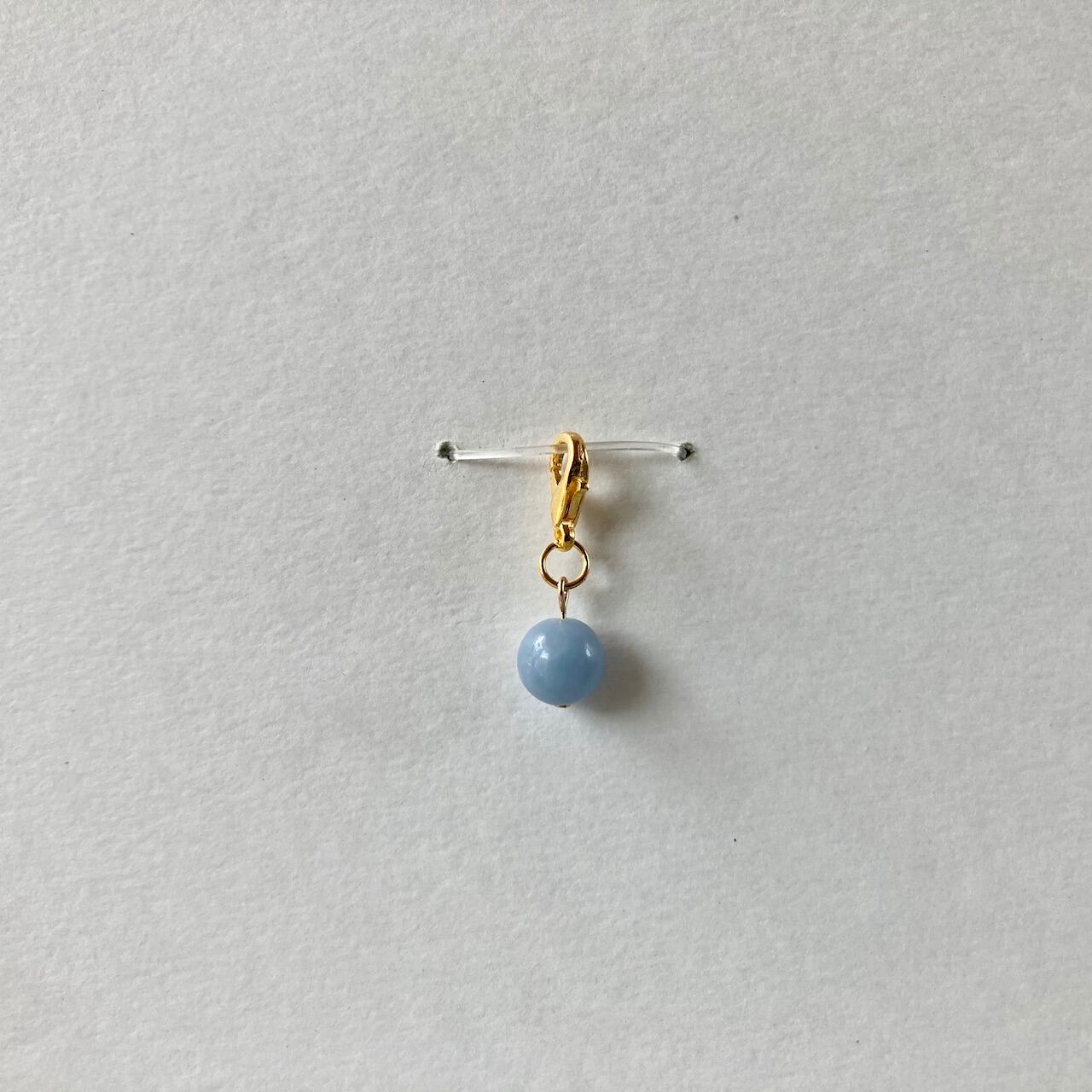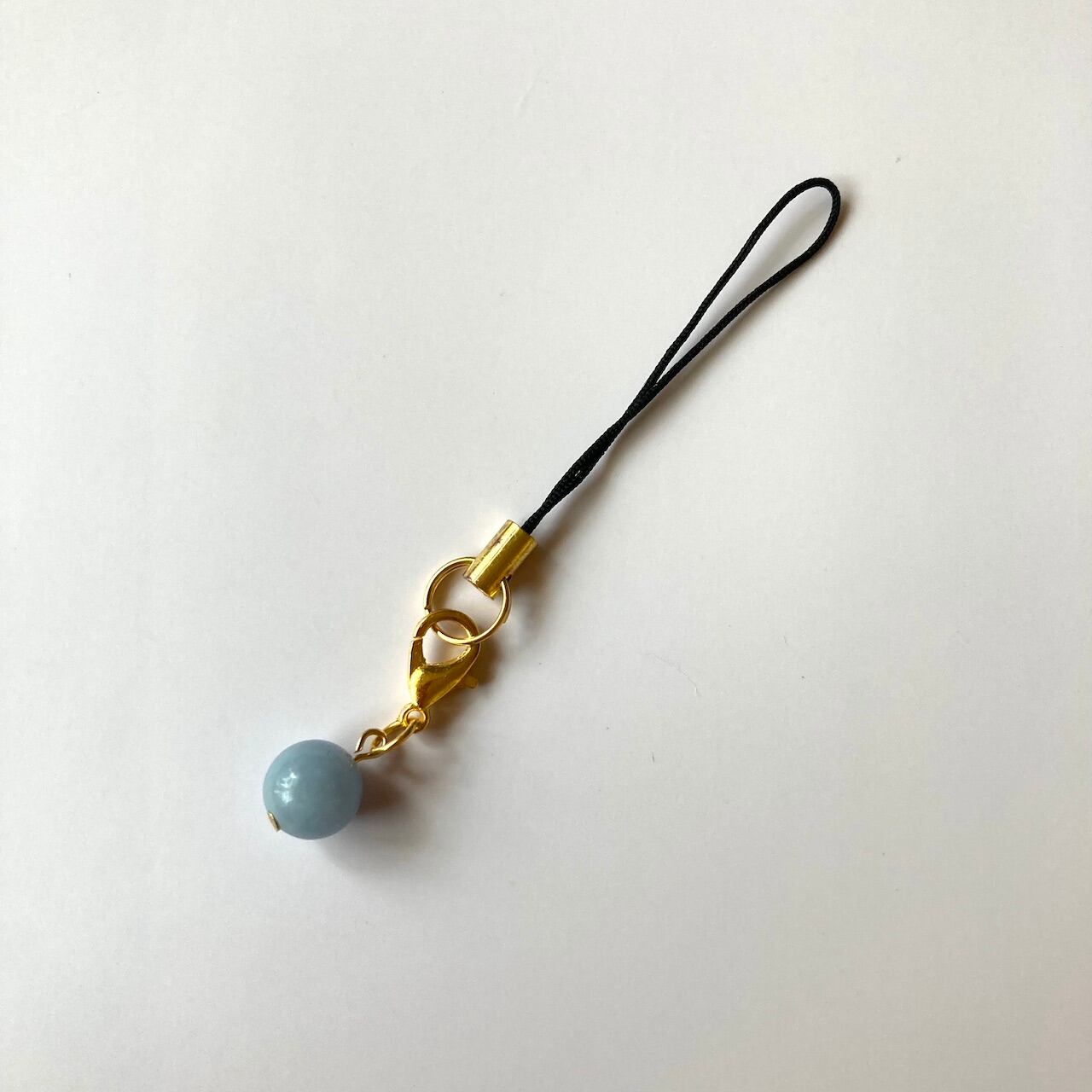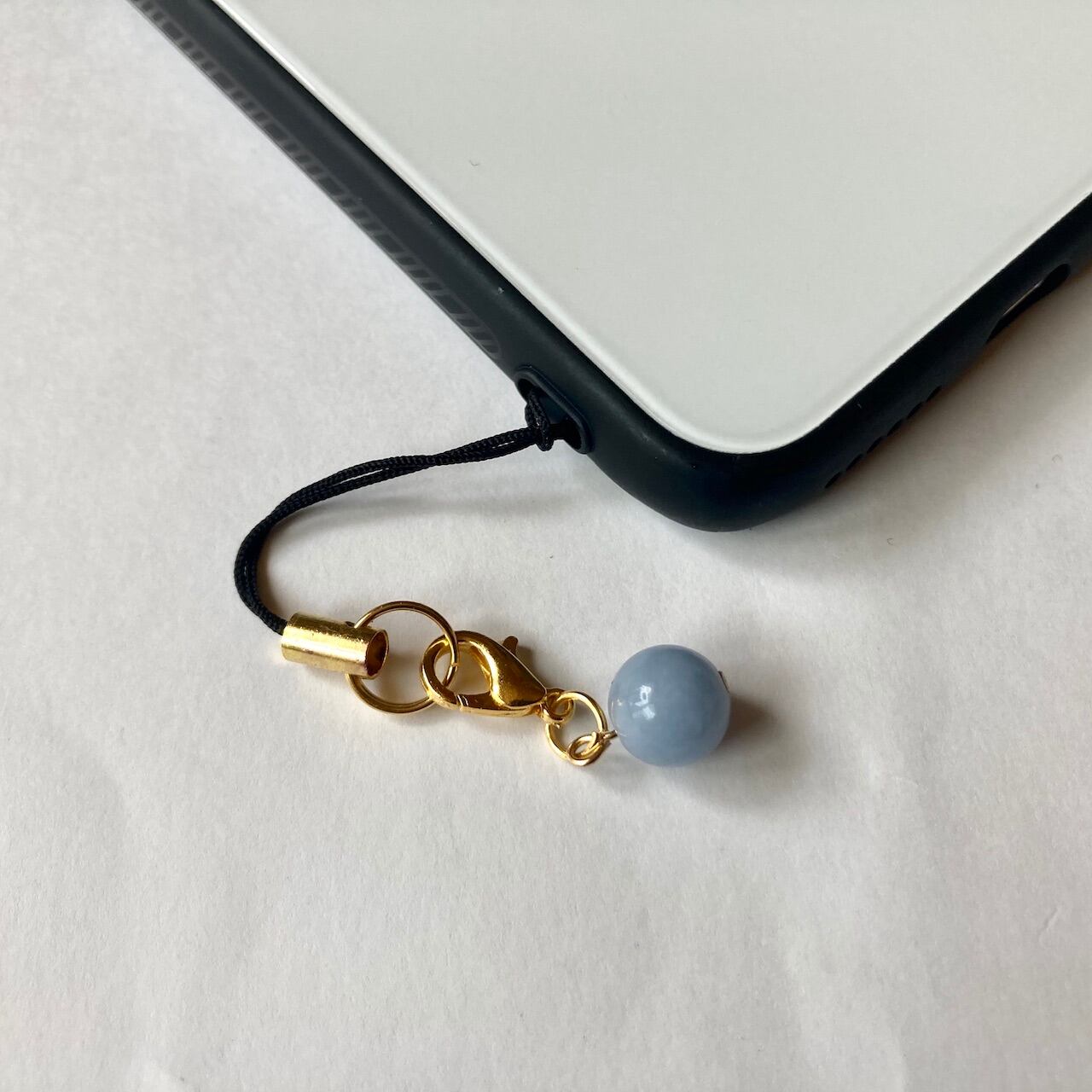 こちらは、8mm玉のエンジェライトを使用した一粒ストラップです。携帯電話にそのまま付けたり、ストラップから取り外しできるデザインに制作しておりますので、ストラップから外してお財布やポーチに付けたり、マスクチャームとも使えるデザインに仕上げています。気になる方は是非この機会にどうぞ。