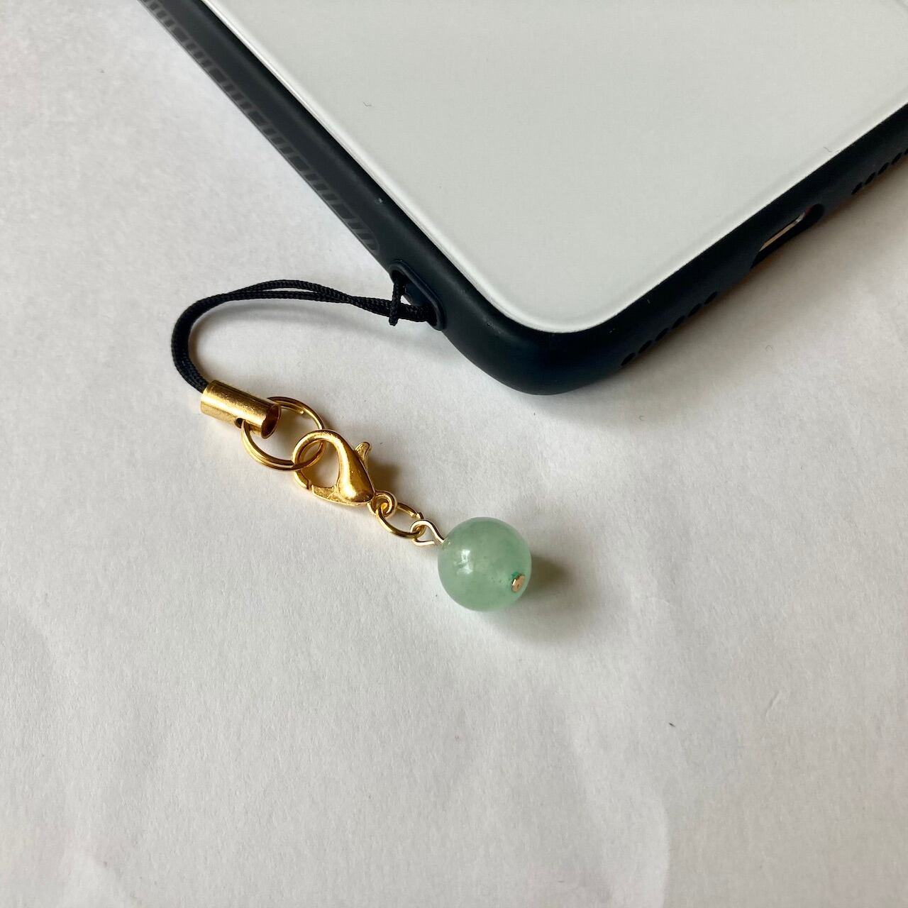 こちらは、8mm玉のアベンチュリンを使用した一粒ストラップです。携帯電話にそのまま付けたり、ストラップから取り外しできるデザインに制作しておりますので、ストラップから外してお財布やポーチに付けたり、マスクチャームとも使えるデザインに仕上げています。気になる方は是非この機会にどうぞ。