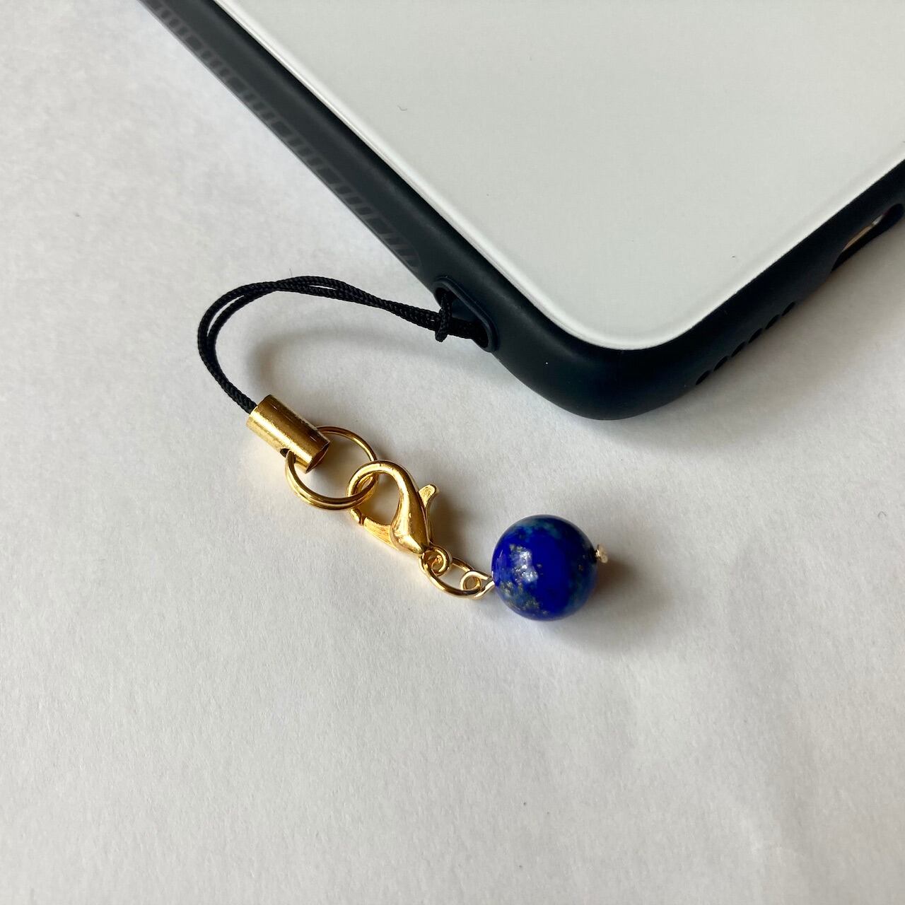 こちらは、8mm玉のラピスラズリを使用した一粒ストラップです。携帯電話にそのまま付けたり、ストラップから取り外しできるデザインに制作しておりますので、ストラップから外してお財布やポーチに付けたり、マスクチャームとも使えるデザインに仕上げています。気になる方は是非この機会にどうぞ。
