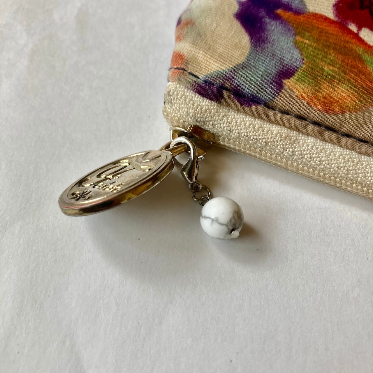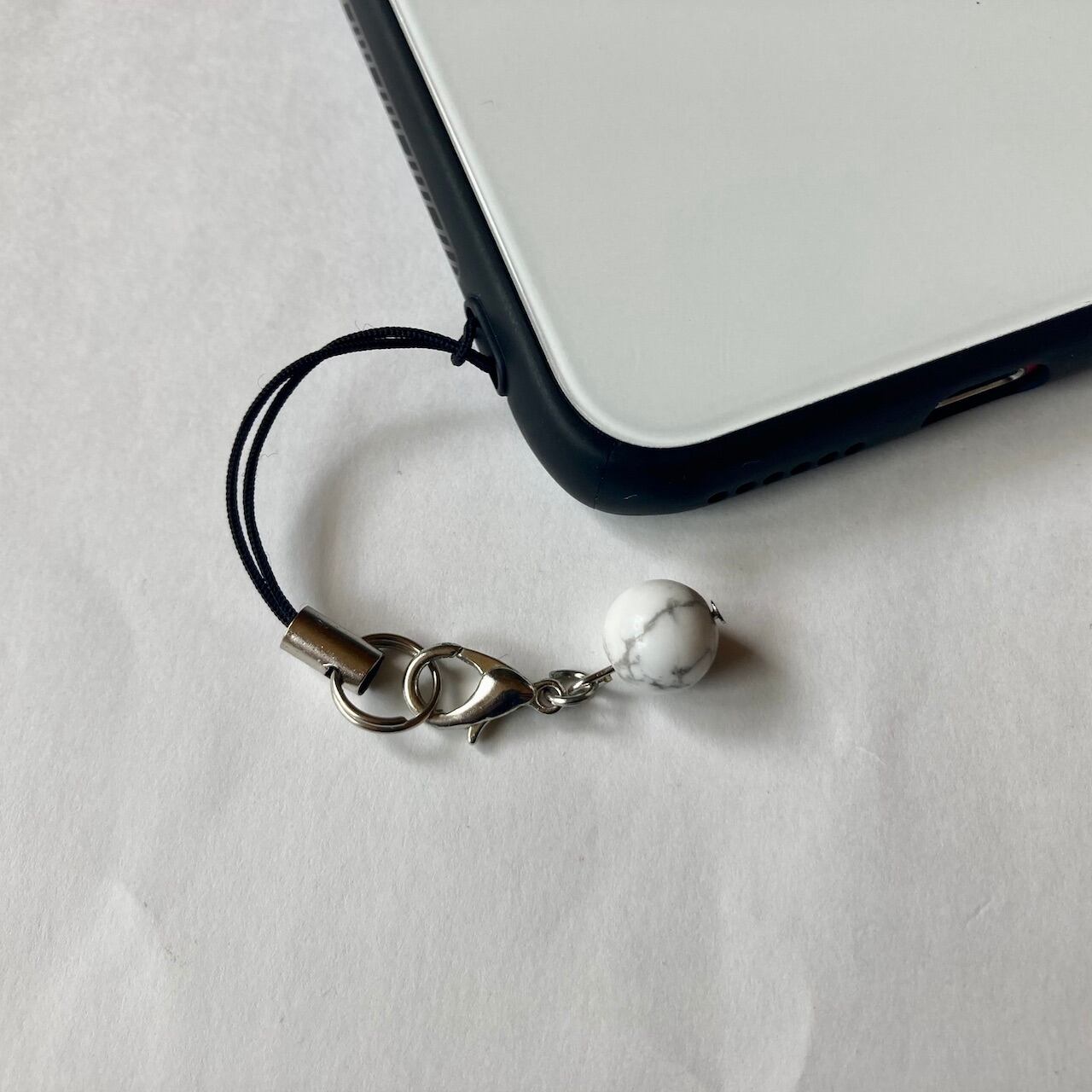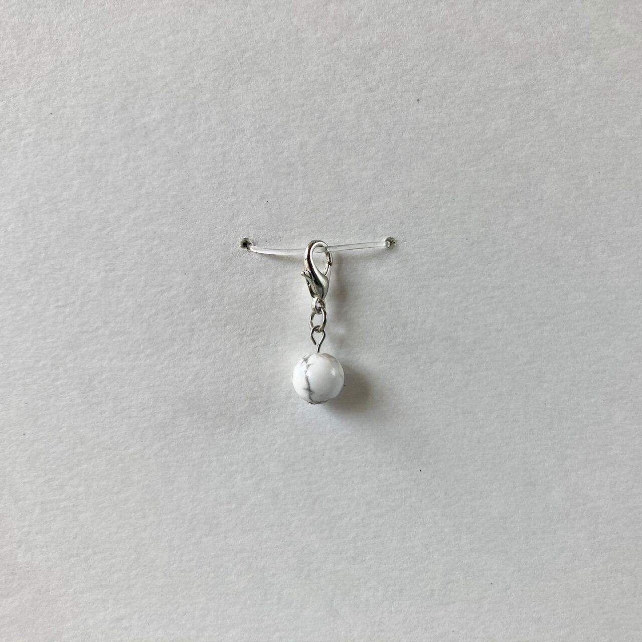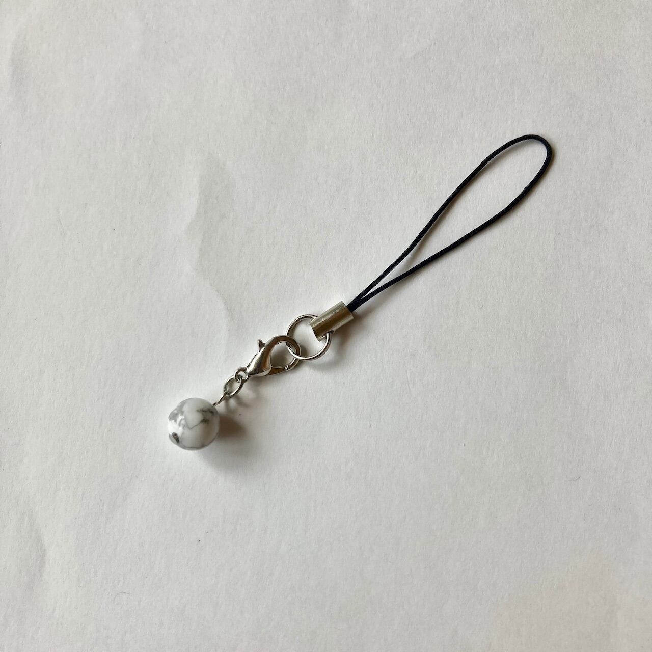 こちらは、8mm玉のハウライトを使用した一粒ストラップです。携帯電話にそのまま付けたり、ストラップから取り外しできるデザインに制作しておりますので、ストラップから外してお財布やポーチに付けたり、マスクチャームとも使えるデザインに仕上げています。気になる方は是非この機会にどうぞ。
