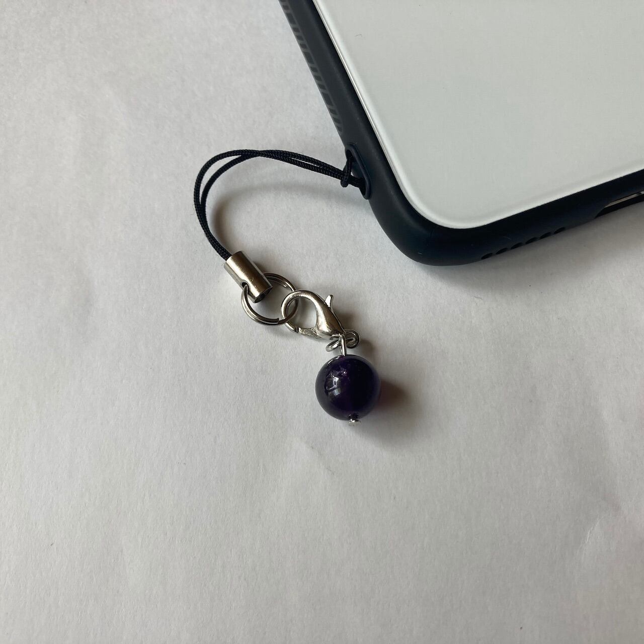 こちらは、8mm玉のアメジストを使用した一粒ストラップです。携帯電話にそのまま付けたり、ストラップから取り外しできるデザインに制作しておりますので、ストラップから外してお財布やポーチに付けたり、マスクチャームとも使えるデザインに仕上げています。気になる方は是非この機会にどうぞ。