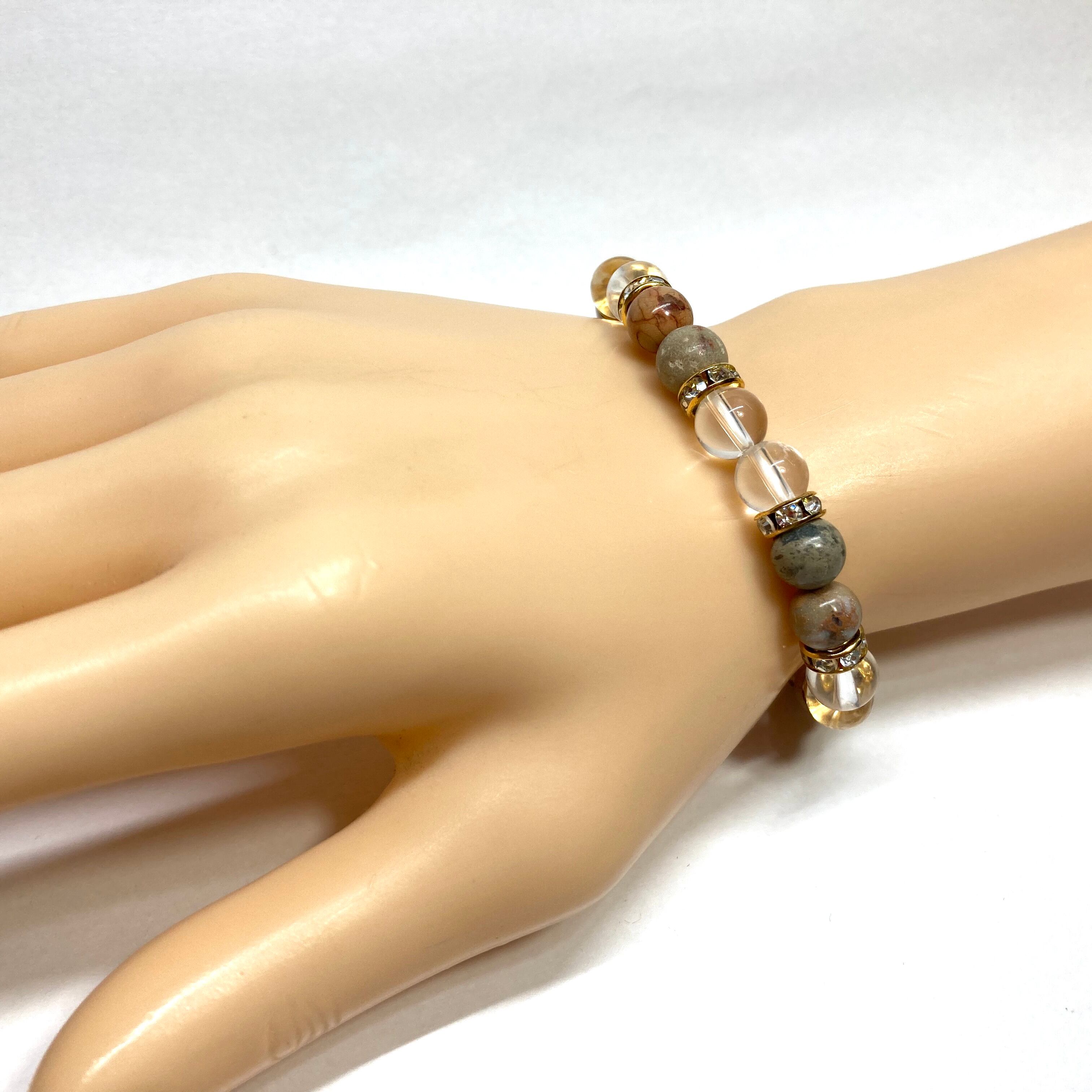 こちらは、8mm玉のインプレッションストーンと水晶を使用した天然石ブレスレットです。石との間に挟まれたロンデルがアクセントになったデザインです。サイズは内周約15cmです。