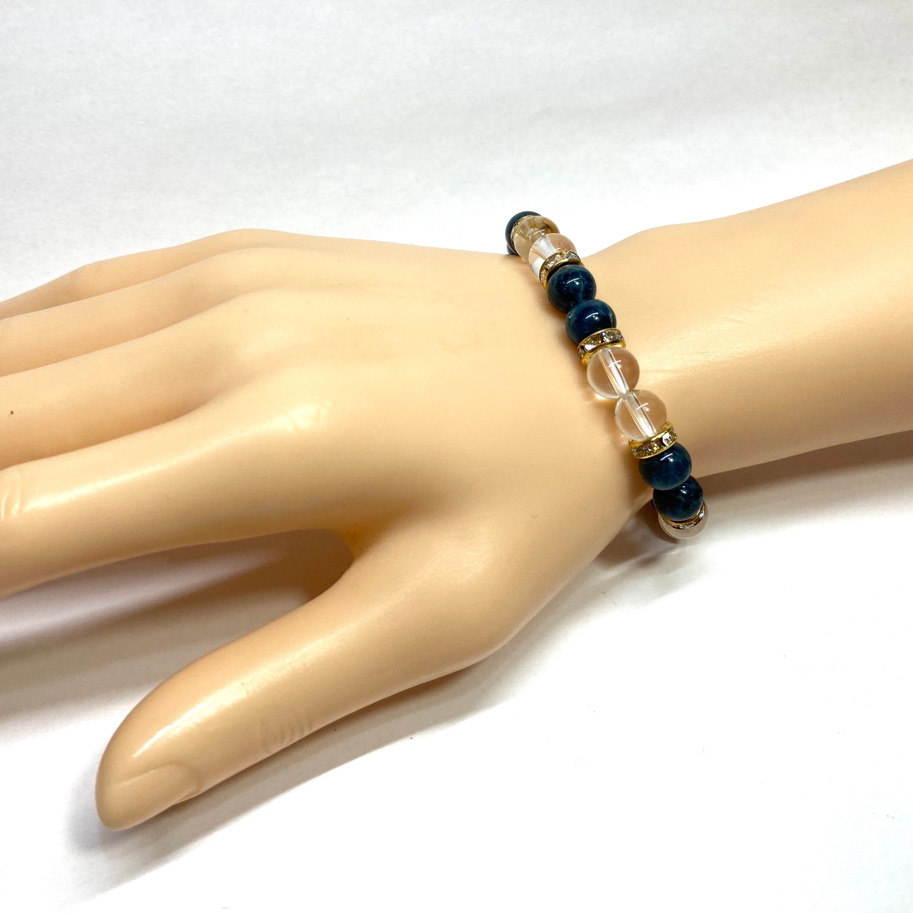 こちらは、8mm玉のアパタイトと水晶を使用した天然石ブレスレットです。石との間に挟まれたロンデルがアクセントになったデザインです。サイズは内周約15cmです。